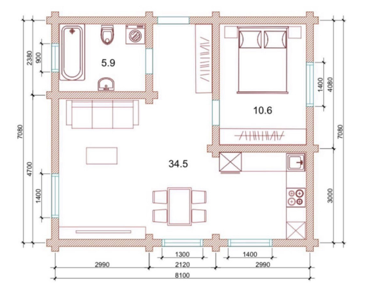 Общая площадь 55 м2