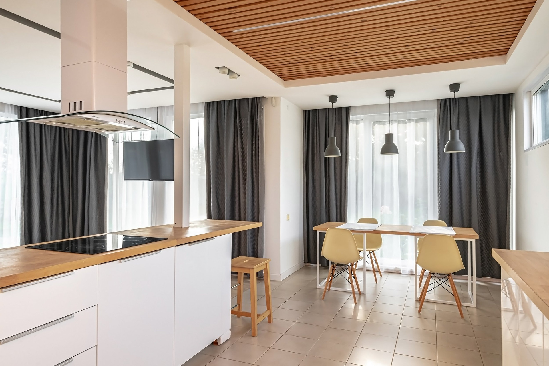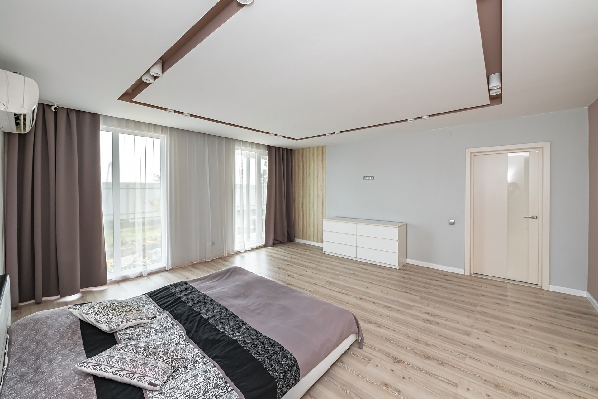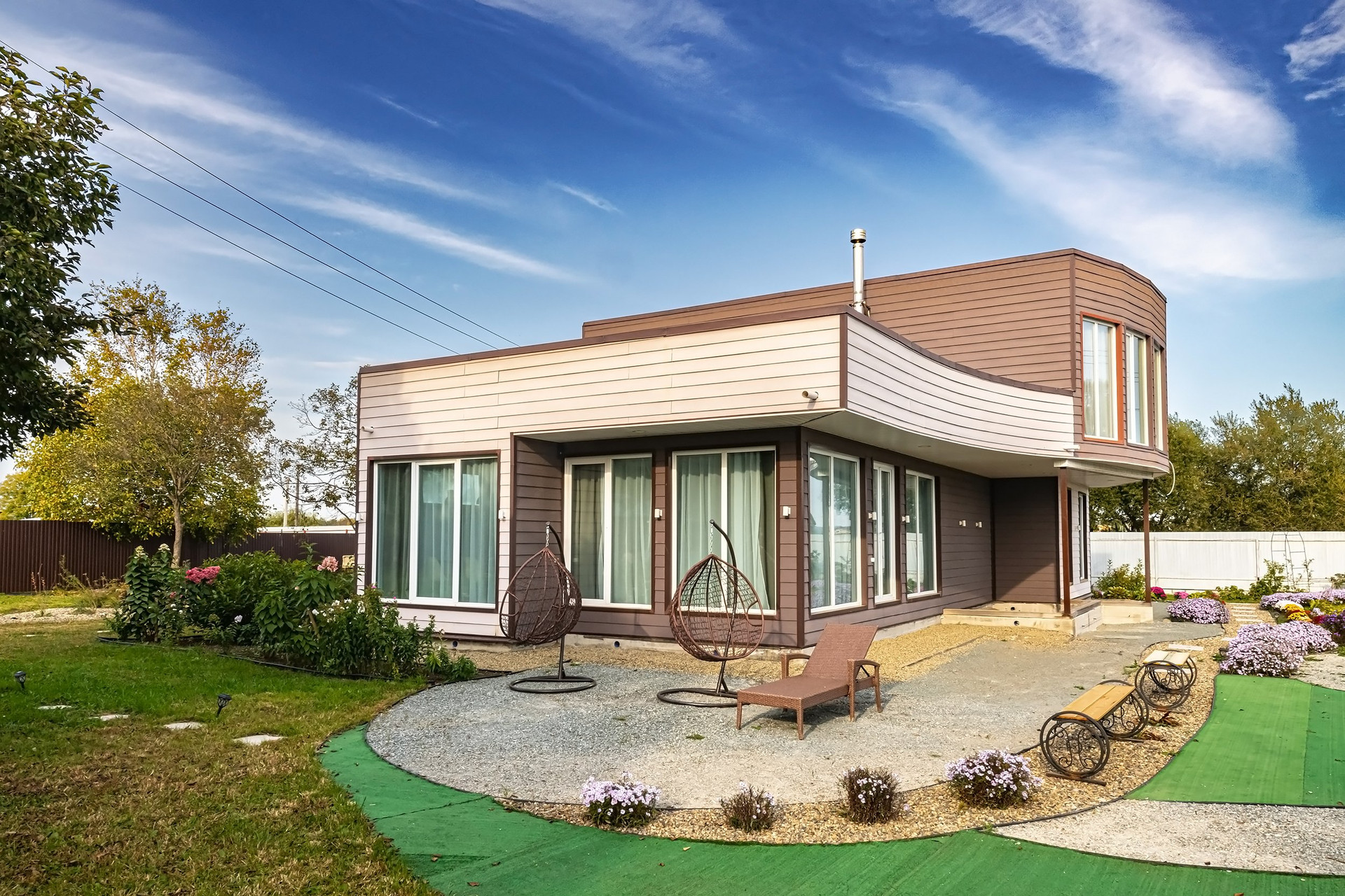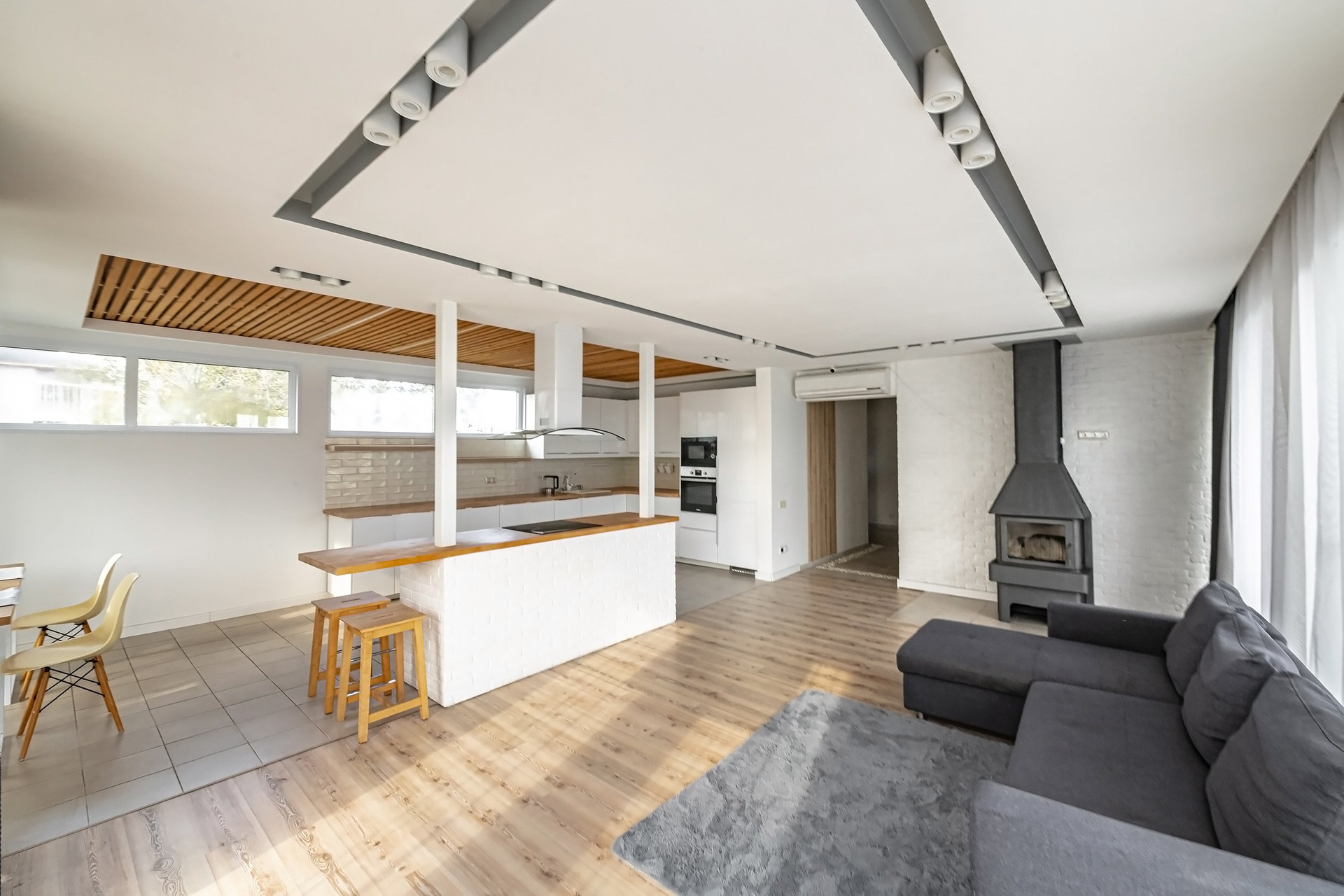 Также была уделена особая внимание функциональной планировке дома. Дом имеет 2 спальни, а также детскую и гостевую комнаты, каждая из которых оборудована собственными санитарными узлами и гардеробными. Кухня и гостиная объединены с каминной зоной, создавая стильное, современное и комфортное пространство для эстетов и ценителей красоты.
