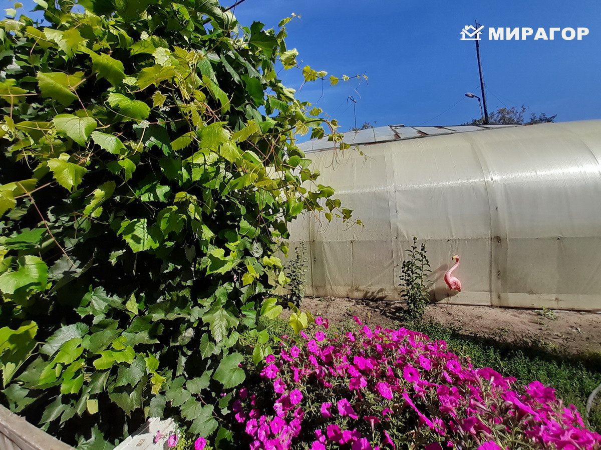 Хороший фруктовый сад (3 яблони, тернослив, виноград нескольких сортов очень вкусный, малина, смородина: черная, белая, красная, клубника, 2 большие теплицы, участок под картофель, огород ухожен.