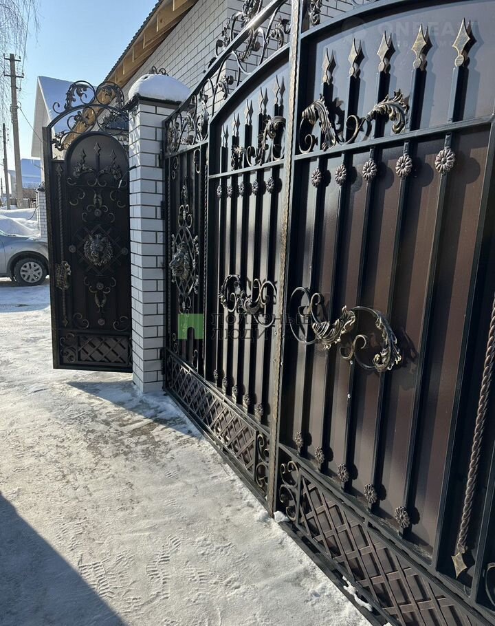 По всему периметру забор, на внешней стороне кованый забор с декоративными элементами, между котором кирпичные столбы.