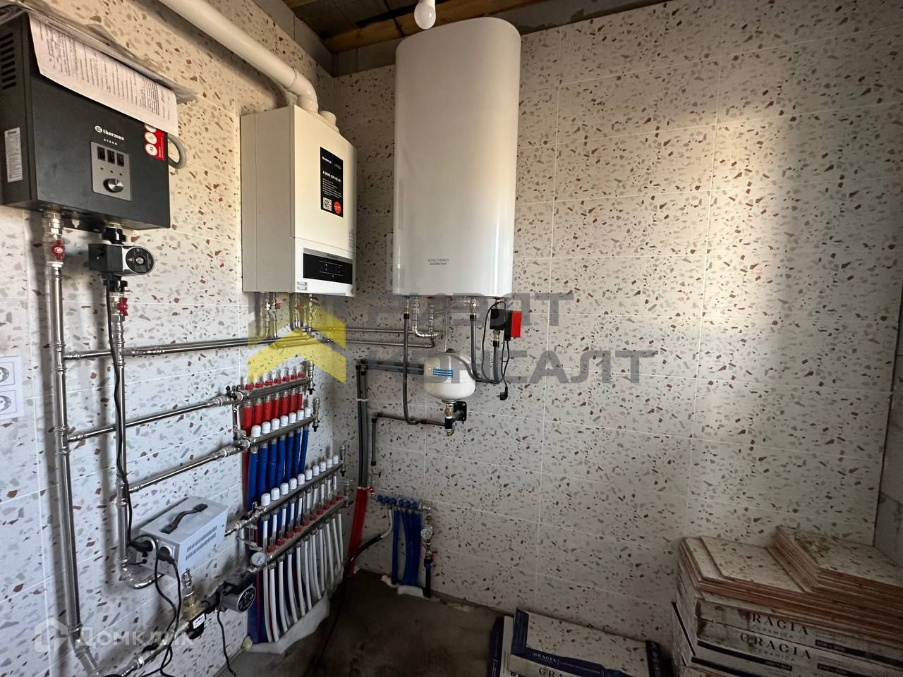 Система отопления: радиаторы и теплые полы по всей площади. Горячее водоснабжение через бойлер косвенного нагрева с системой рециркуляции (открыл кран и сразу горячая вода). Газовый котел (Воsсh) и электрокотел (Кеntаtsu), система удаленного управления и мониторинга котлами (ZОNТ). Обвязка котельной на нержавейке. Трубы теплого пола и радиаторов отопления металлопластик. Все внутридомовое водоснабжение на аксиальных латунных фитингах и трубе с утолщенной стенкой. Качественные расширительные баки фирмы Rеflех.