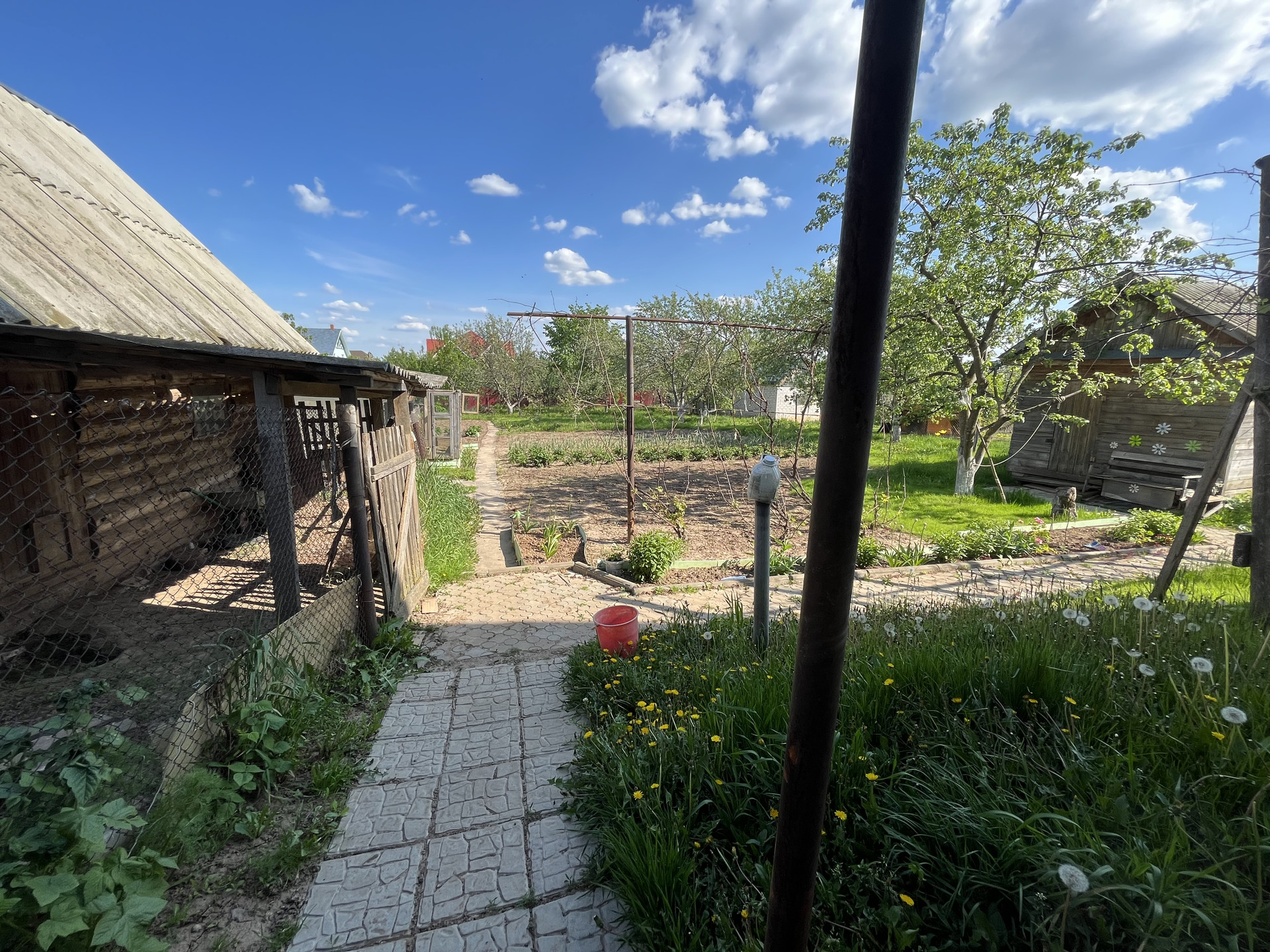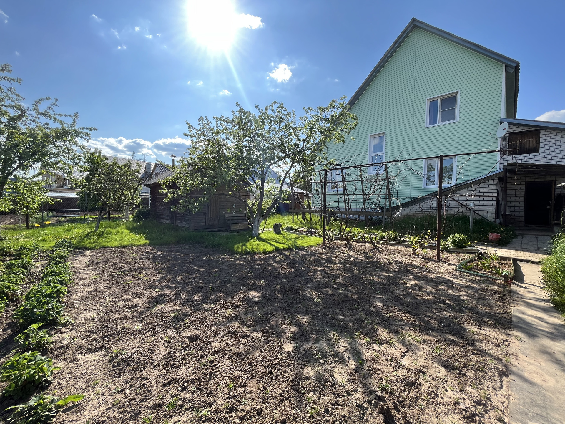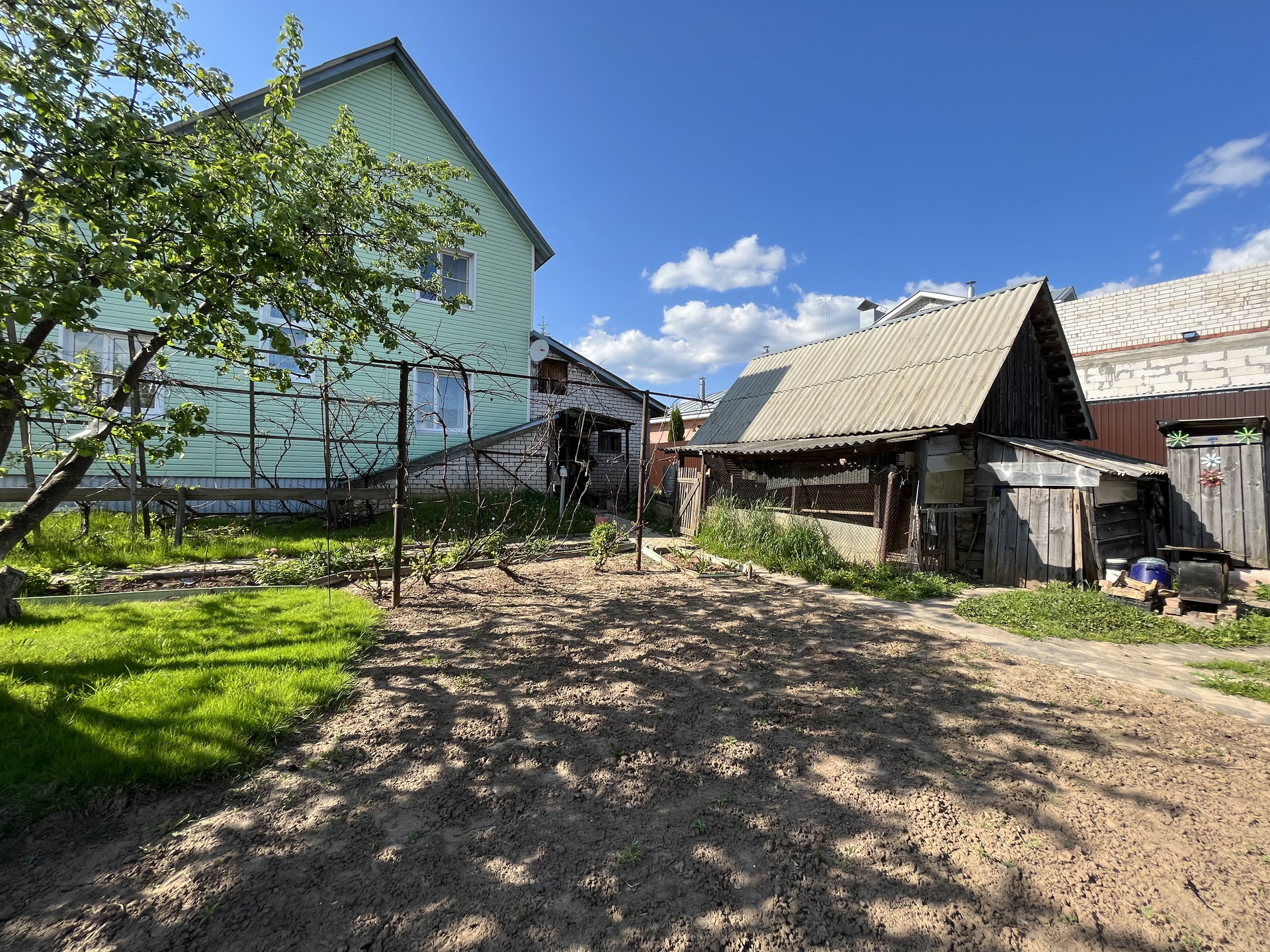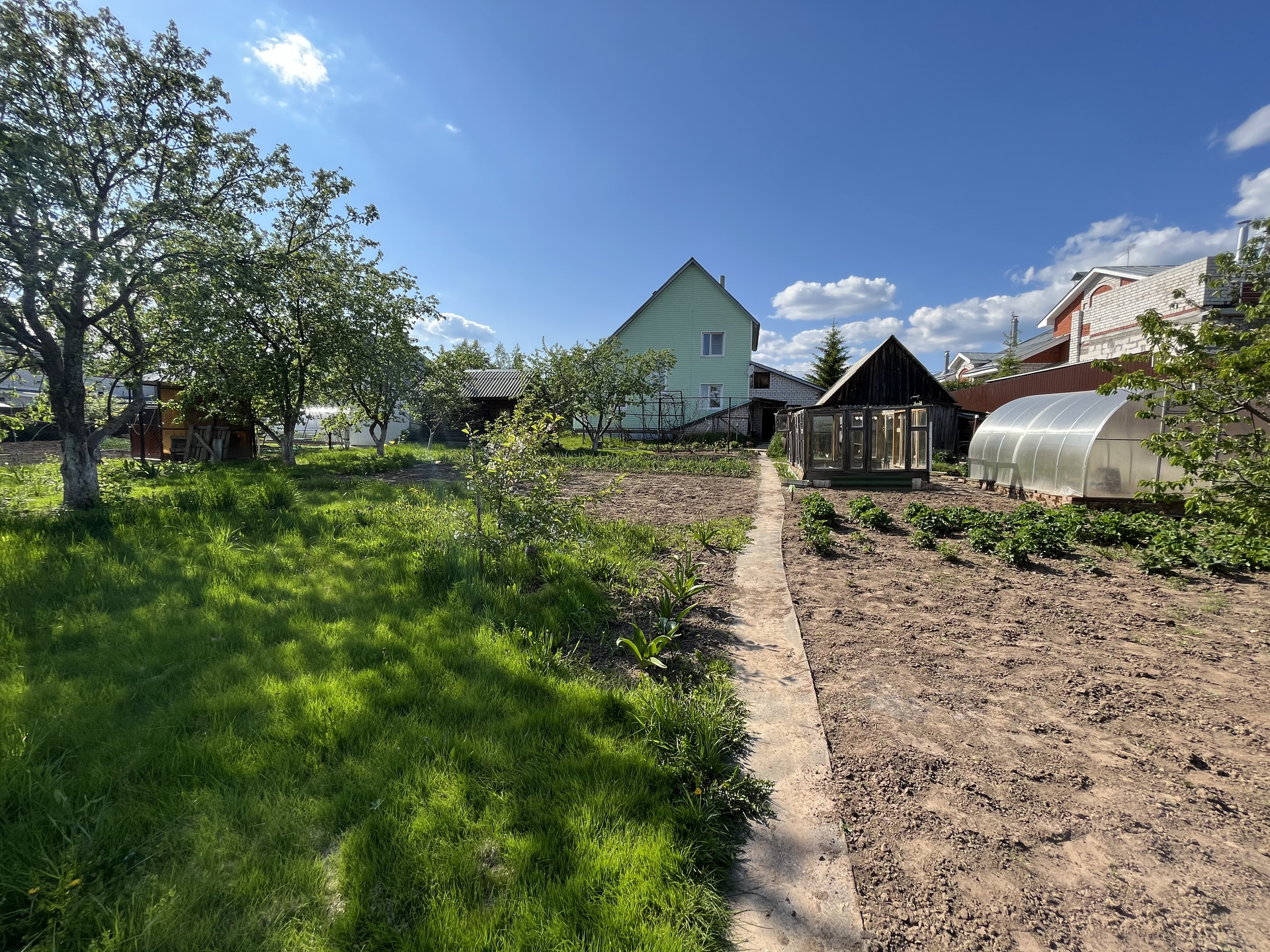 Очень ухоженный сад, баня (рабочая), сарай (для свиней и птиц с огороженной территорией, теплица (поликарбонат)