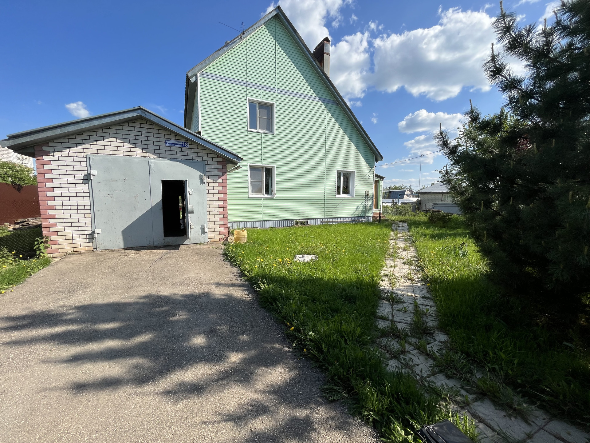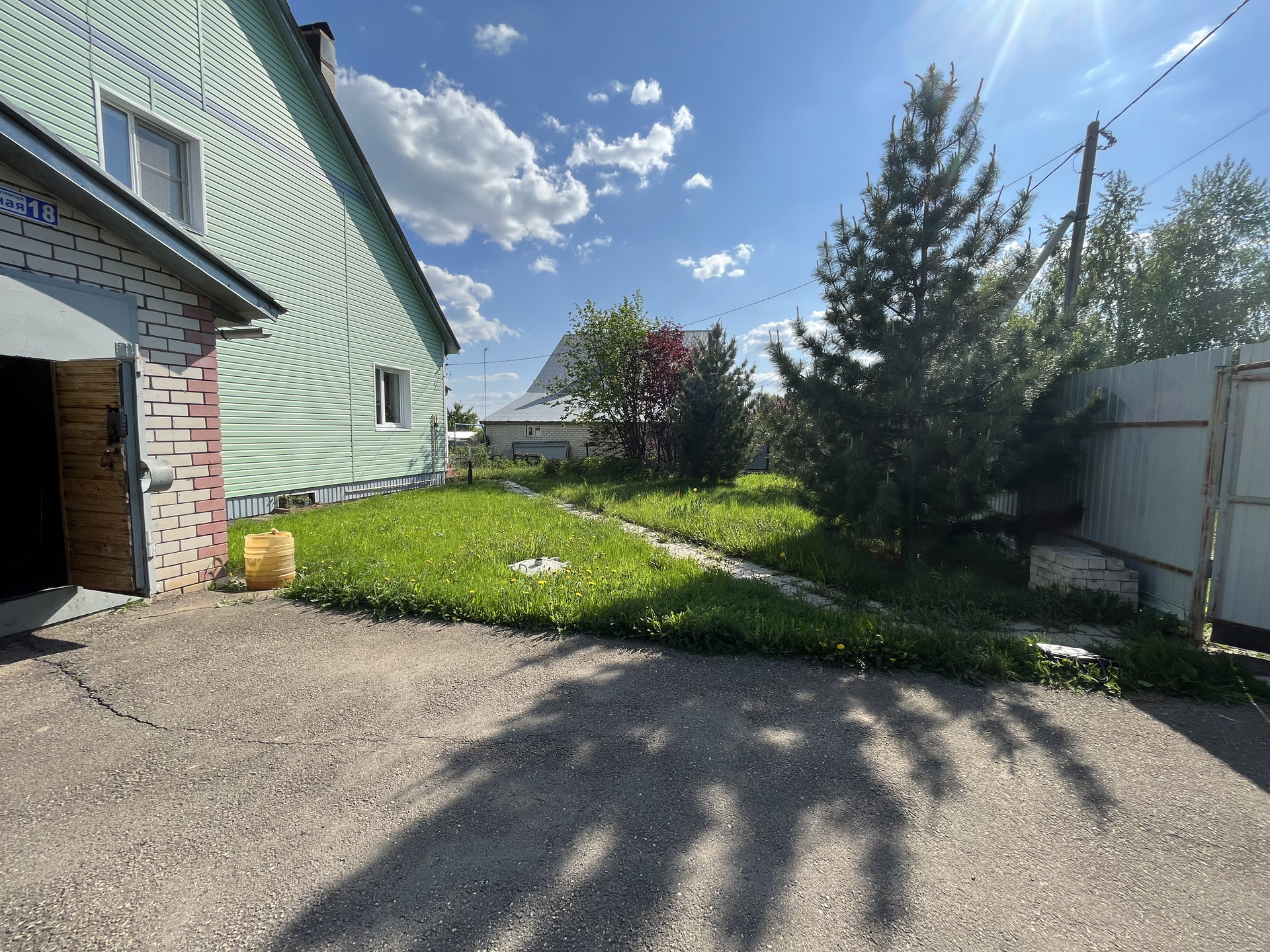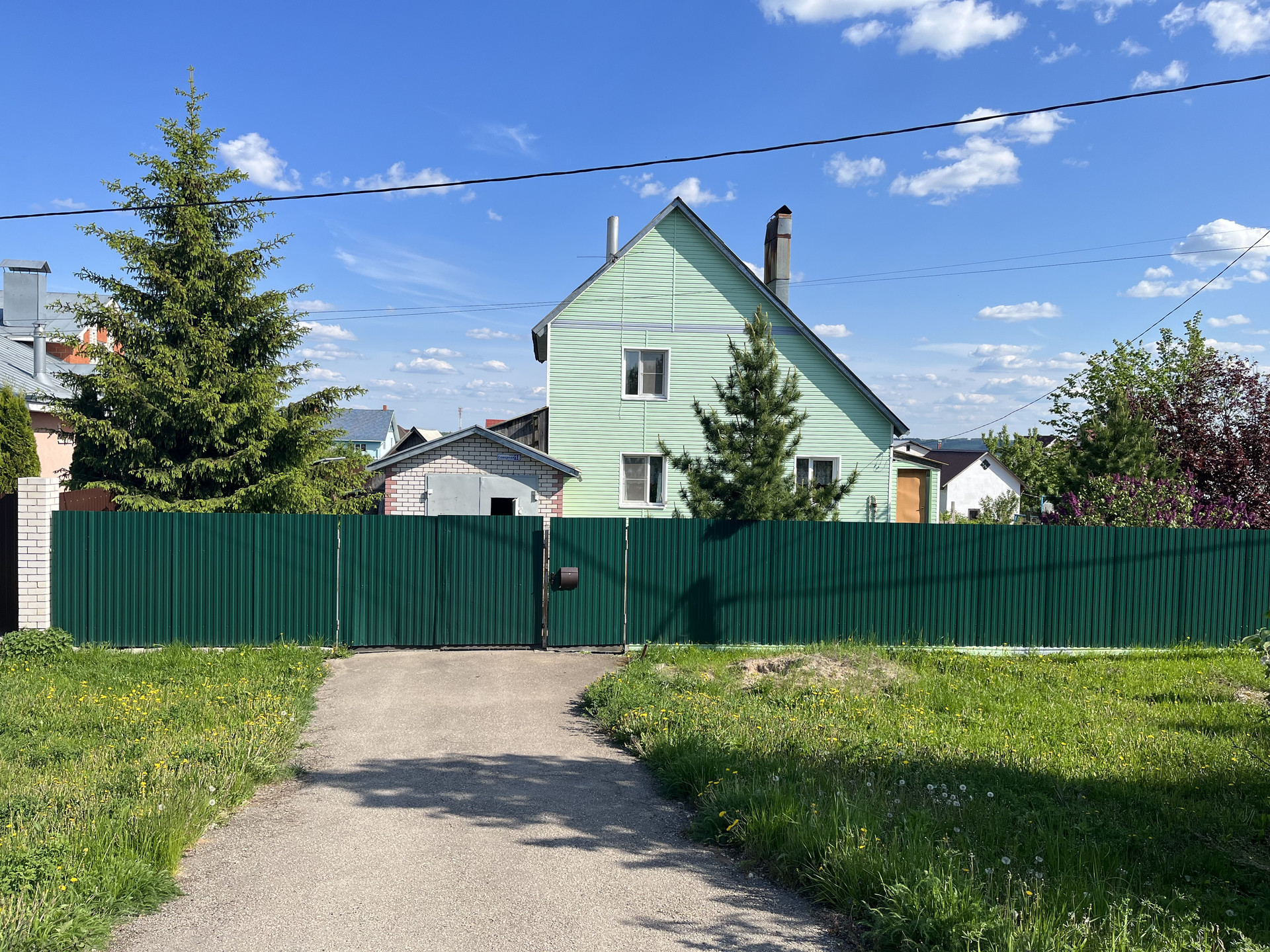 огорожен забором (профнастил), пристроенный гараж (с ямой), Кровля - металлическая
