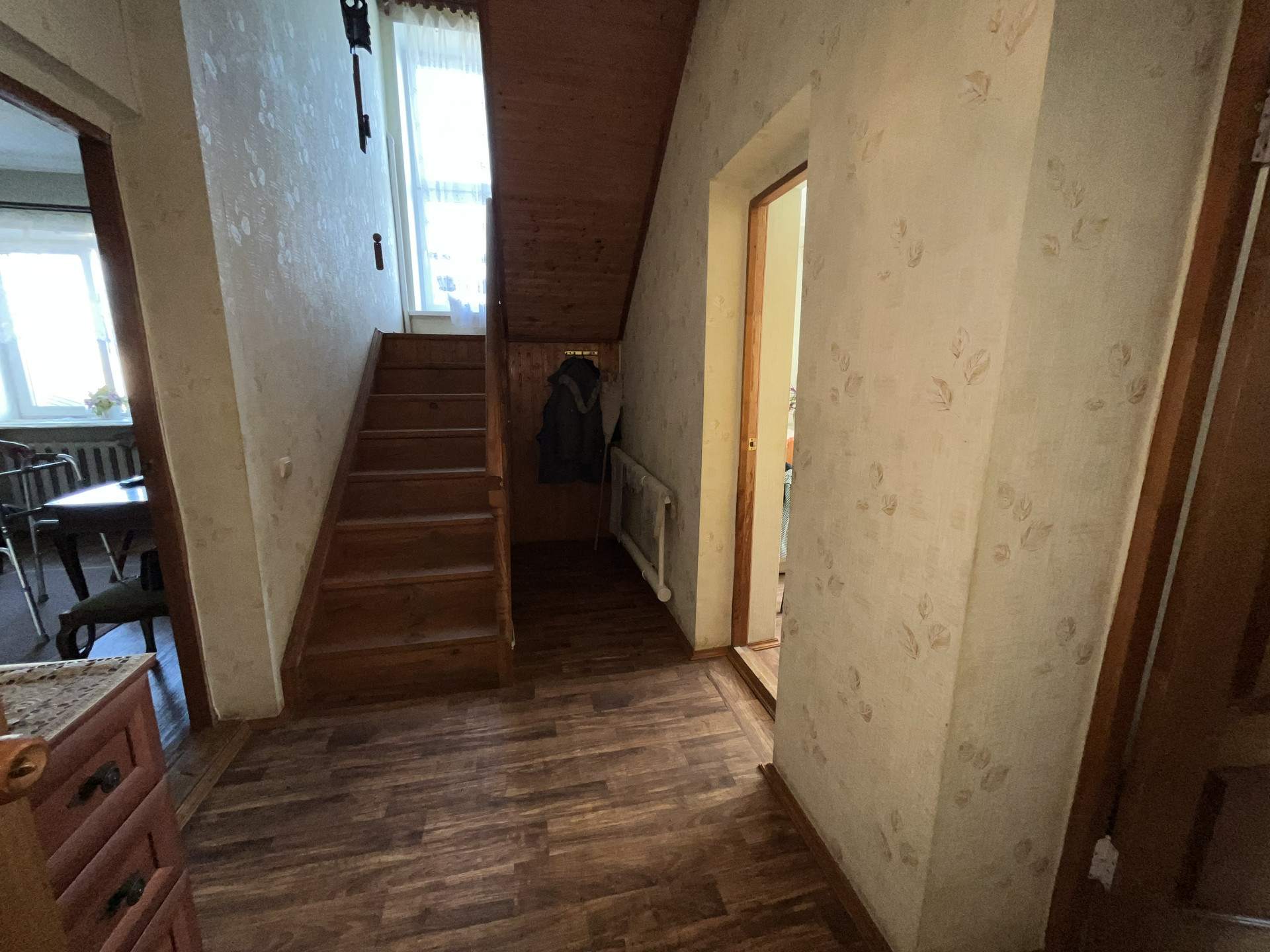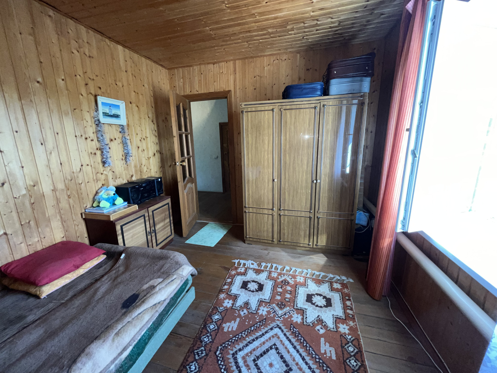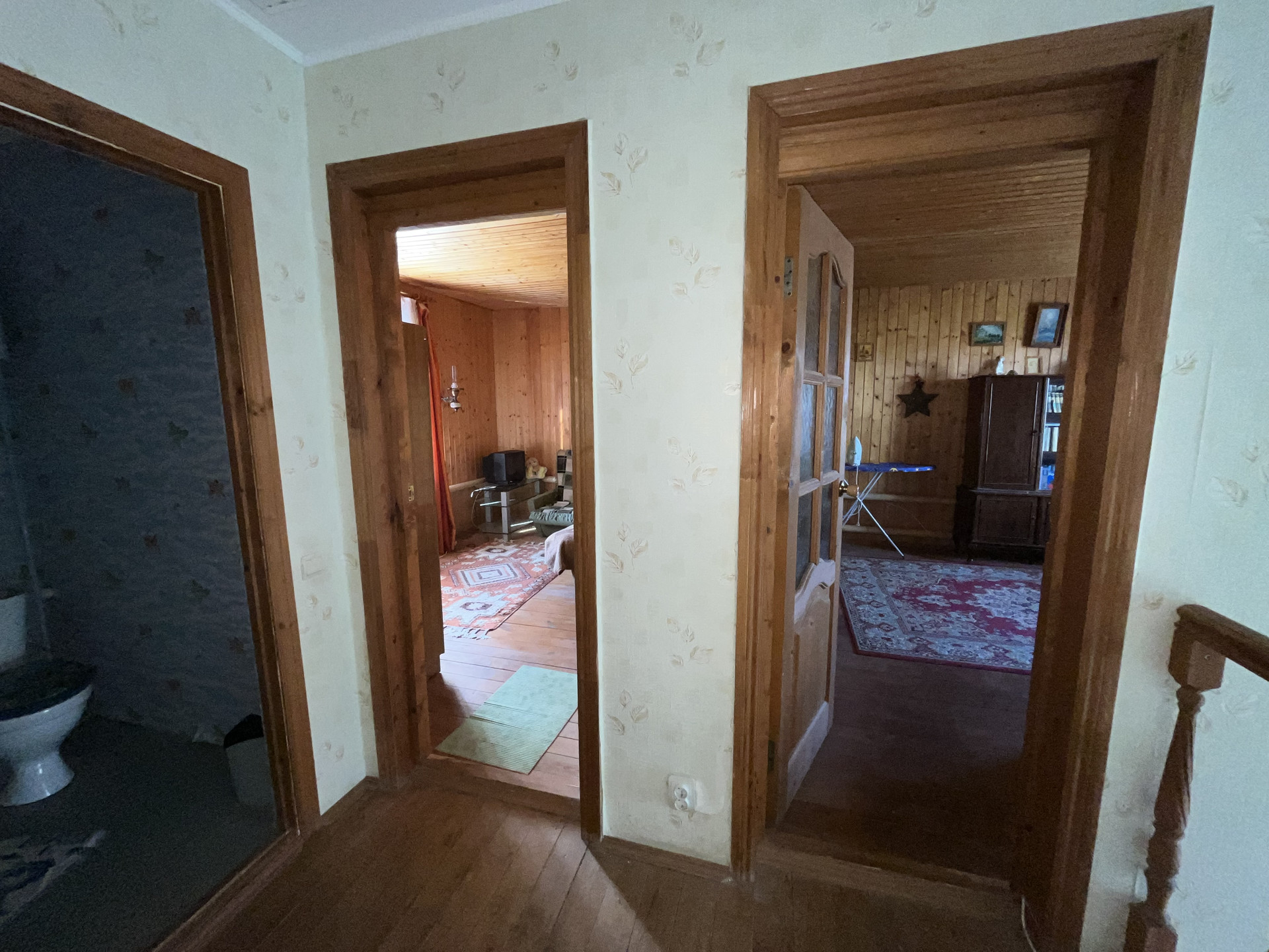 2 этаж - лестница деревянная: Сан узел (требуется ремонт), 1 комната (обшита вагонкой - покрыта лаком) окна в Сад, 2 комната (обшита вагонкой - покрыта лаком) окна на улицу