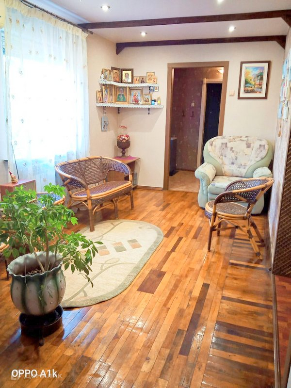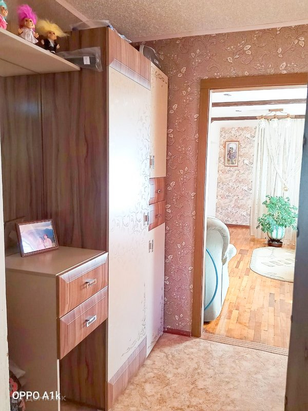 На полу в кухне линолеум, в комнатах паркет, в сан узле плитка.