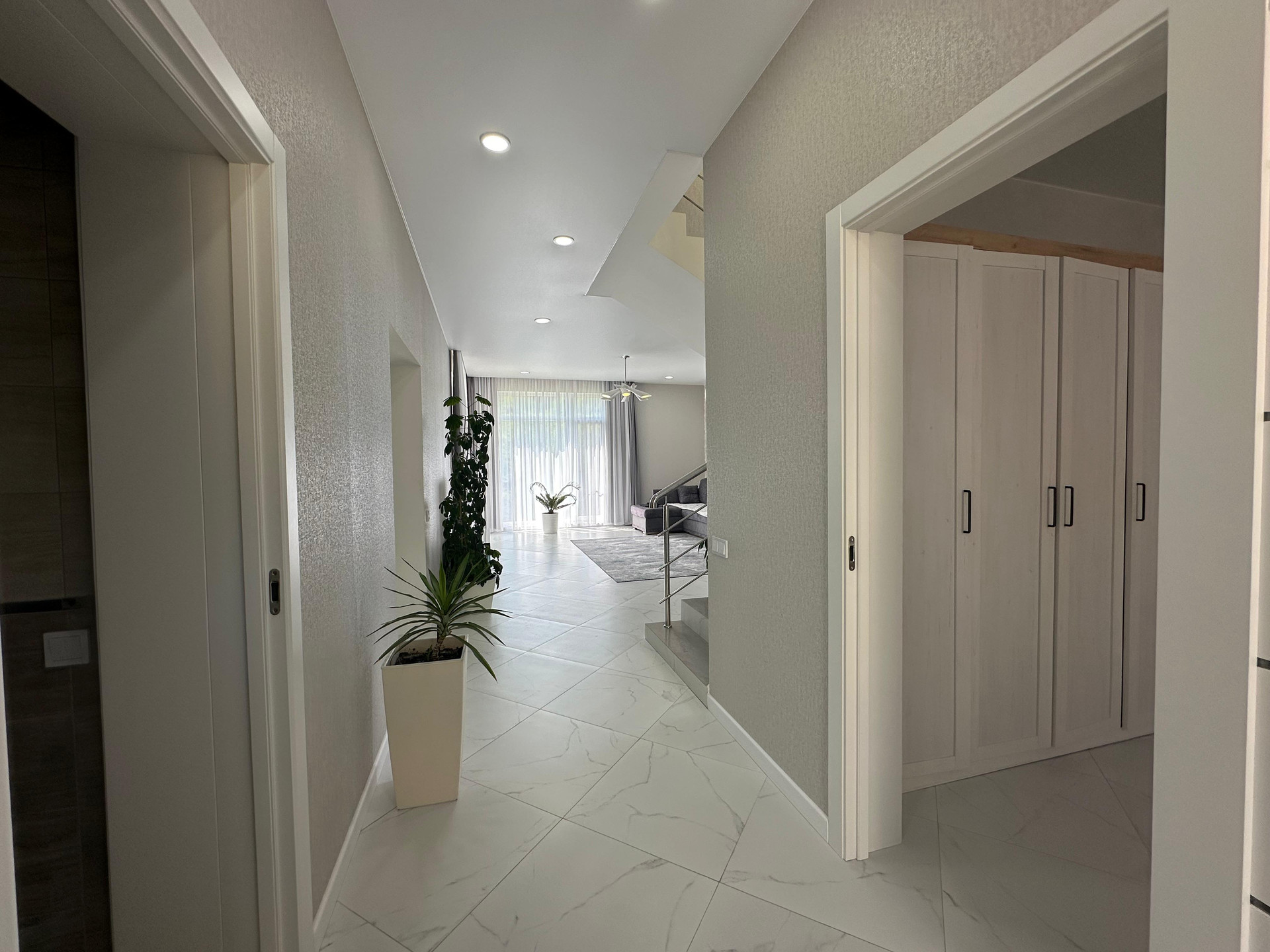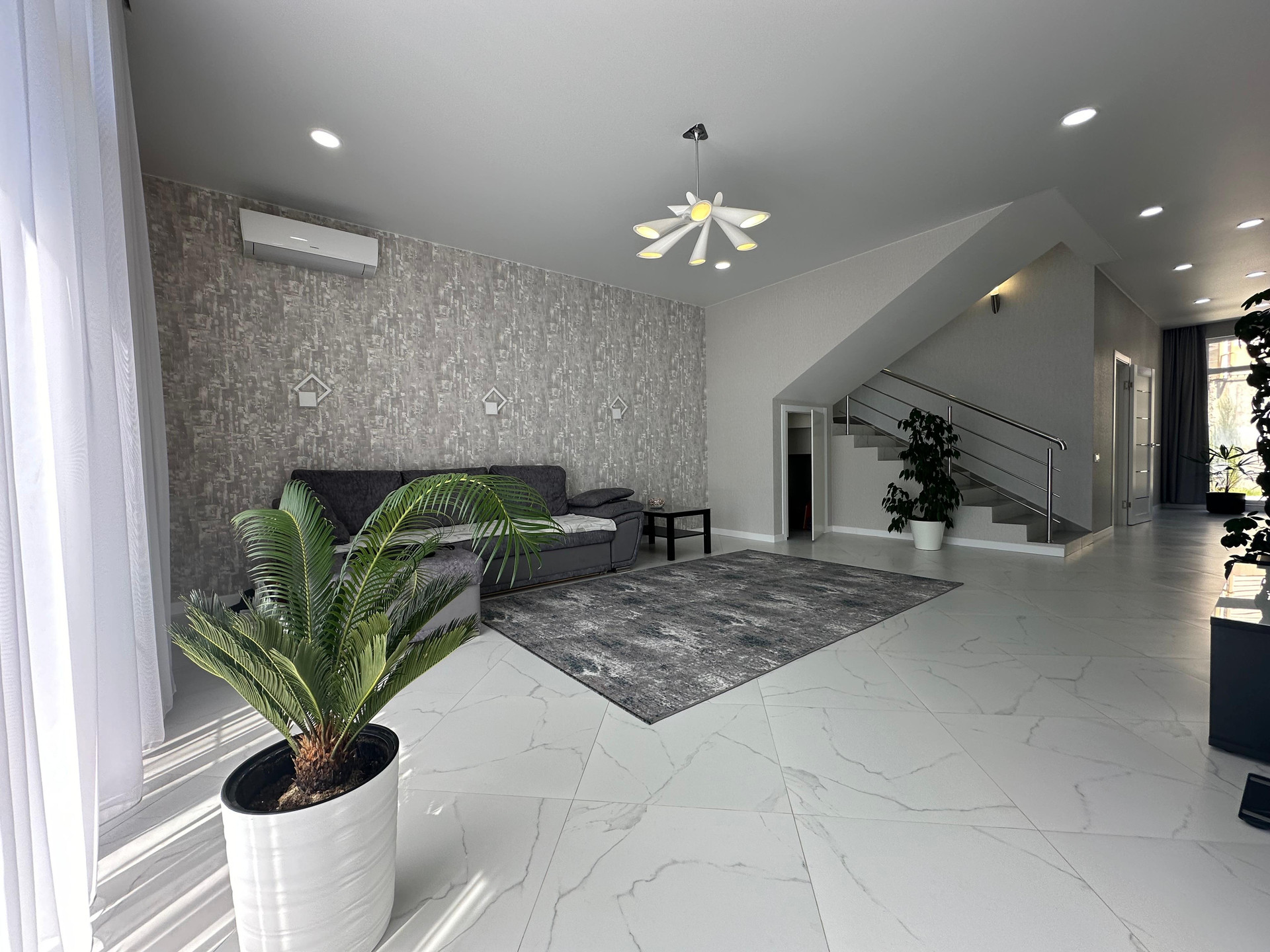 Внутренняя отделка дома выполнена из современных материалов , с светлых тонах.