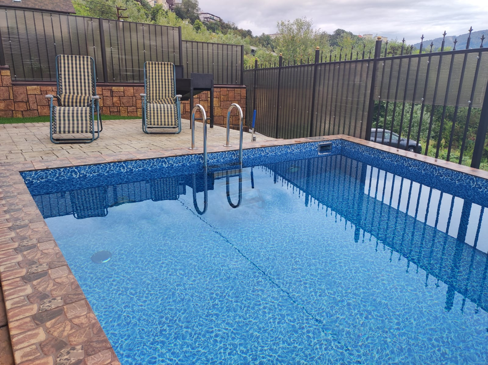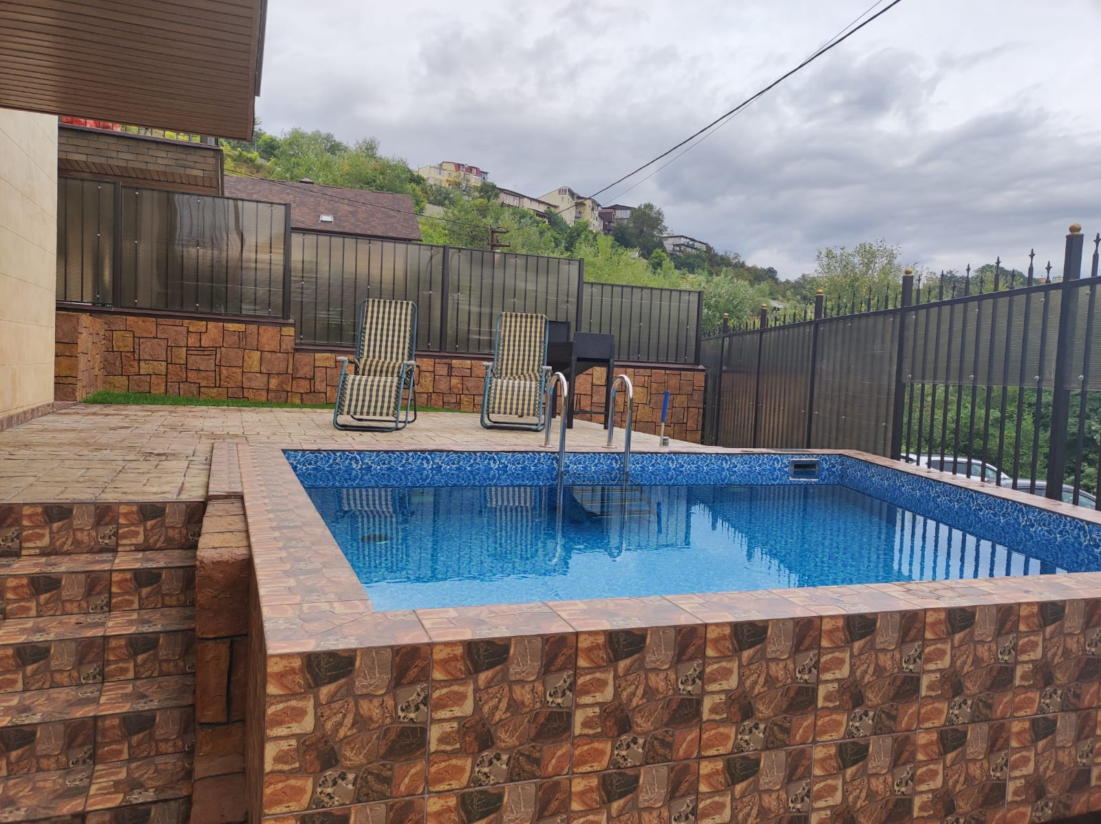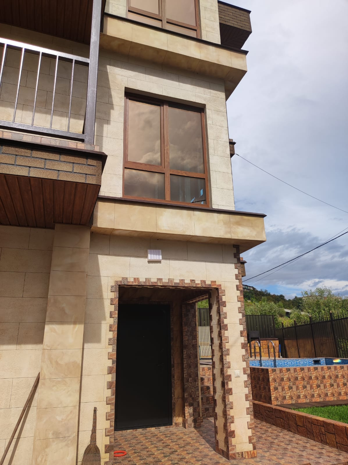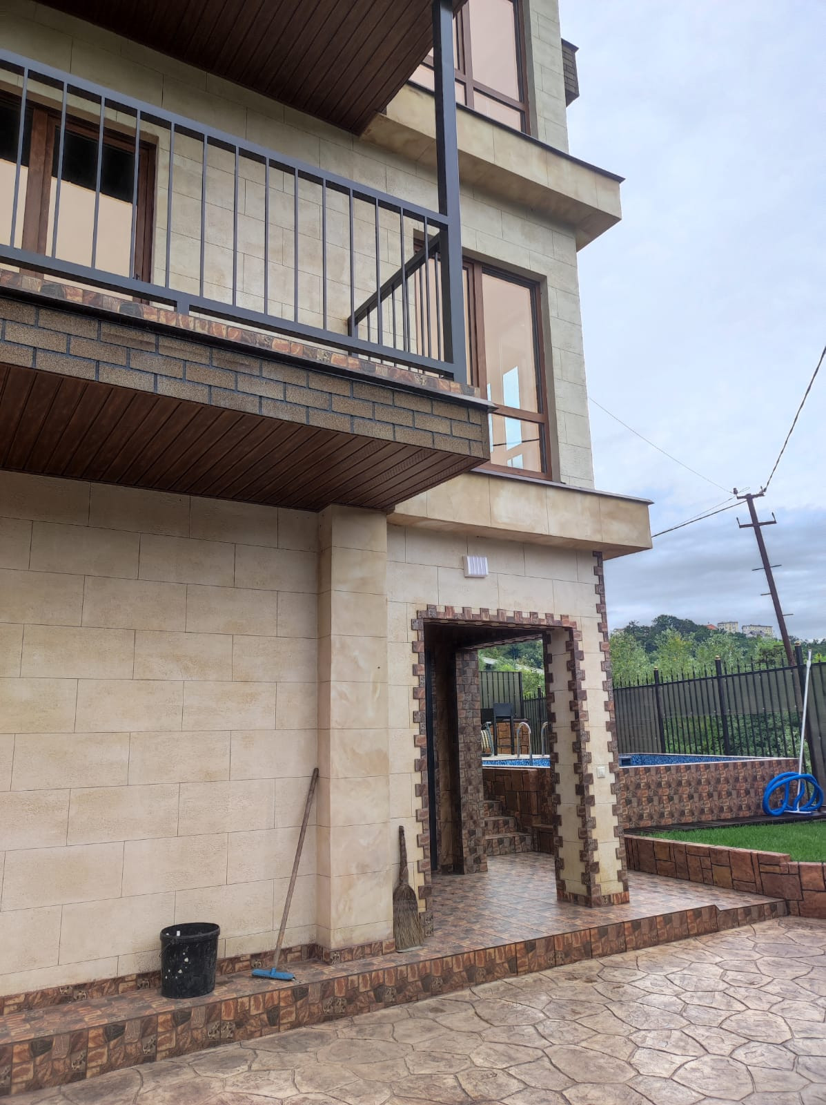 Фасад из жидкого травертина, бассейн, ландшафтный дизайн.