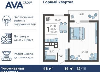 Продается 1-комнатная квартира в доме (Литер 6), срок сдачи : 1 кв. 2025, общей площадью 48 кв.м., на 12 этаже в новом современном жилом комплексе в Сочи «Горный квартал», Хостинский район. Отличный вариант для инвестиций и жизни. Жилой квартал из шести 16-этажных домов находится на горном склоне. Дома расположены таким образом, что из окон каждо... |