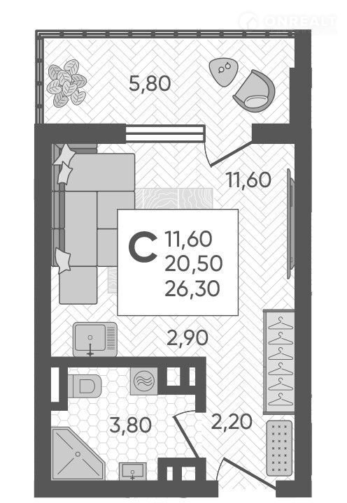 Общая площадь 26.3 м2