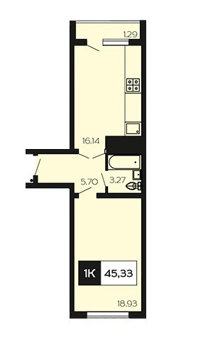 Площадь 44,5 м2 (с учетом балкона фактическая площадь увеличивается до 47,5 м2)