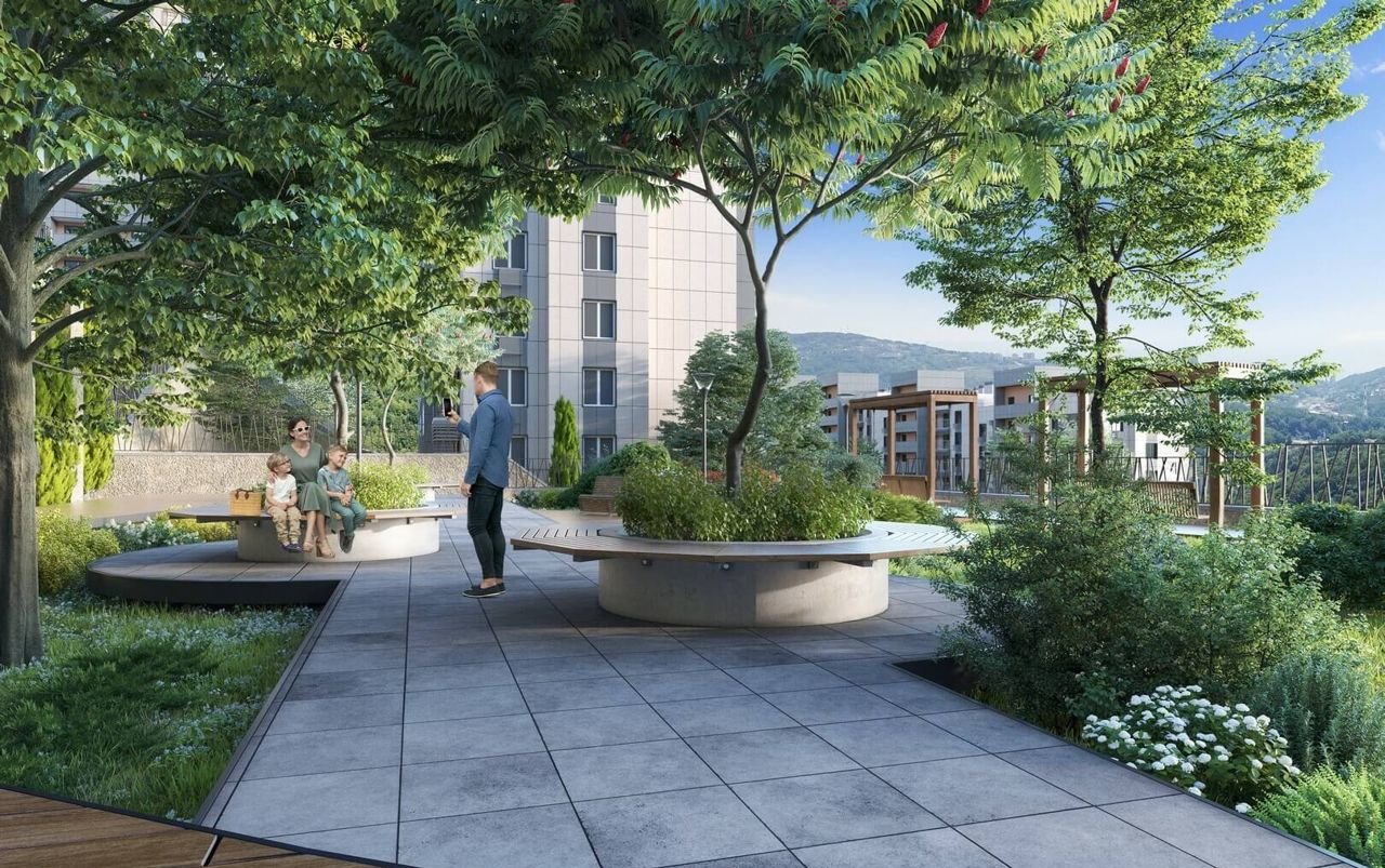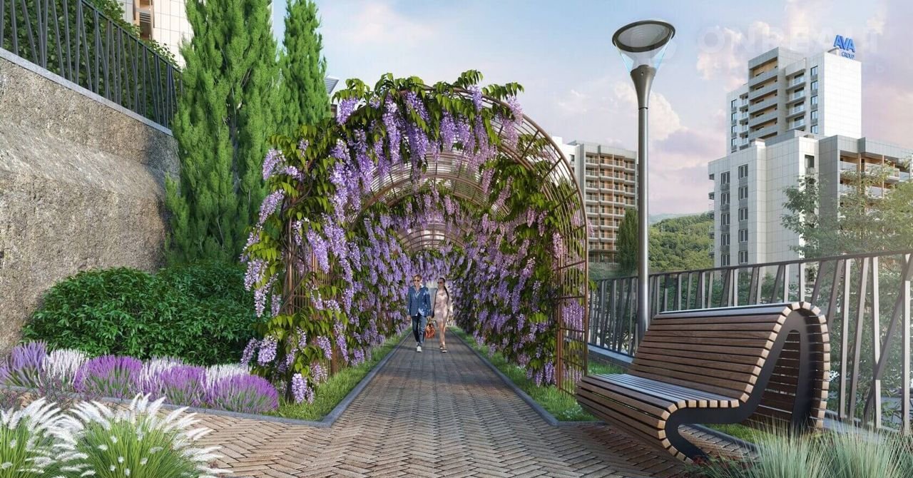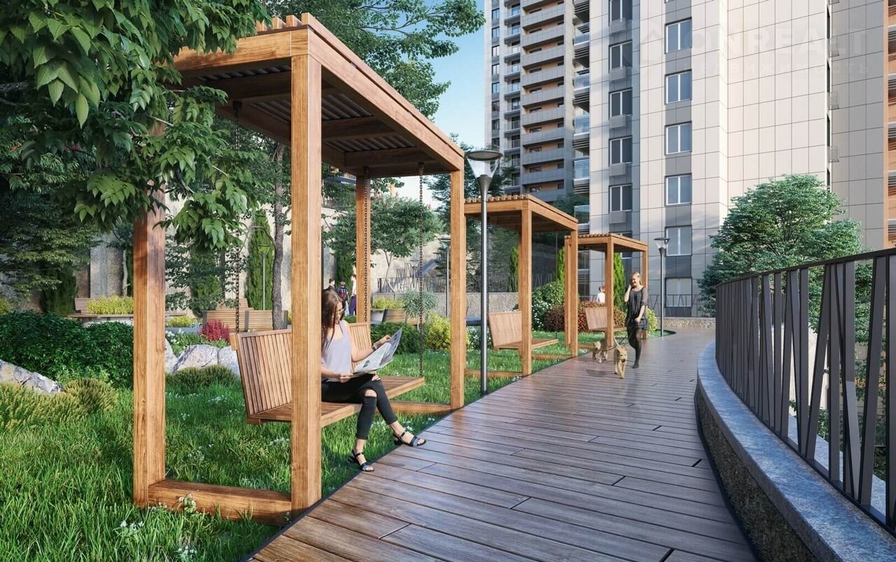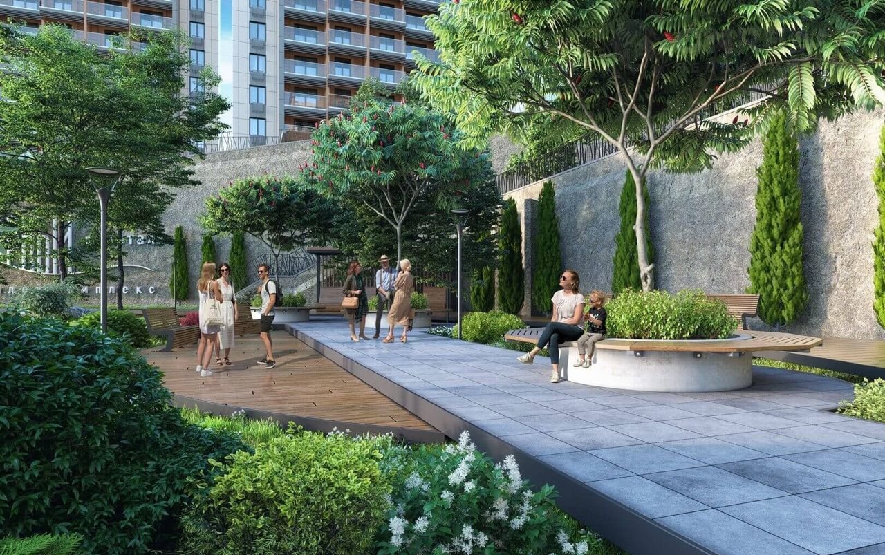 Дворы с великолепными беседками и гамаками под теневыми навесами, ландшафтным дизайном с южными цветами, кинотеатром под открытым небом, спортивными площадками и зоной барбекю