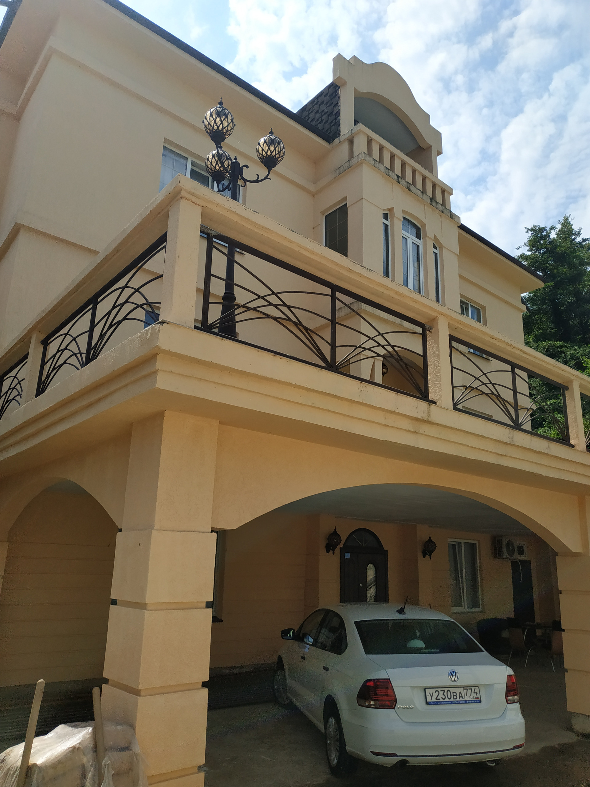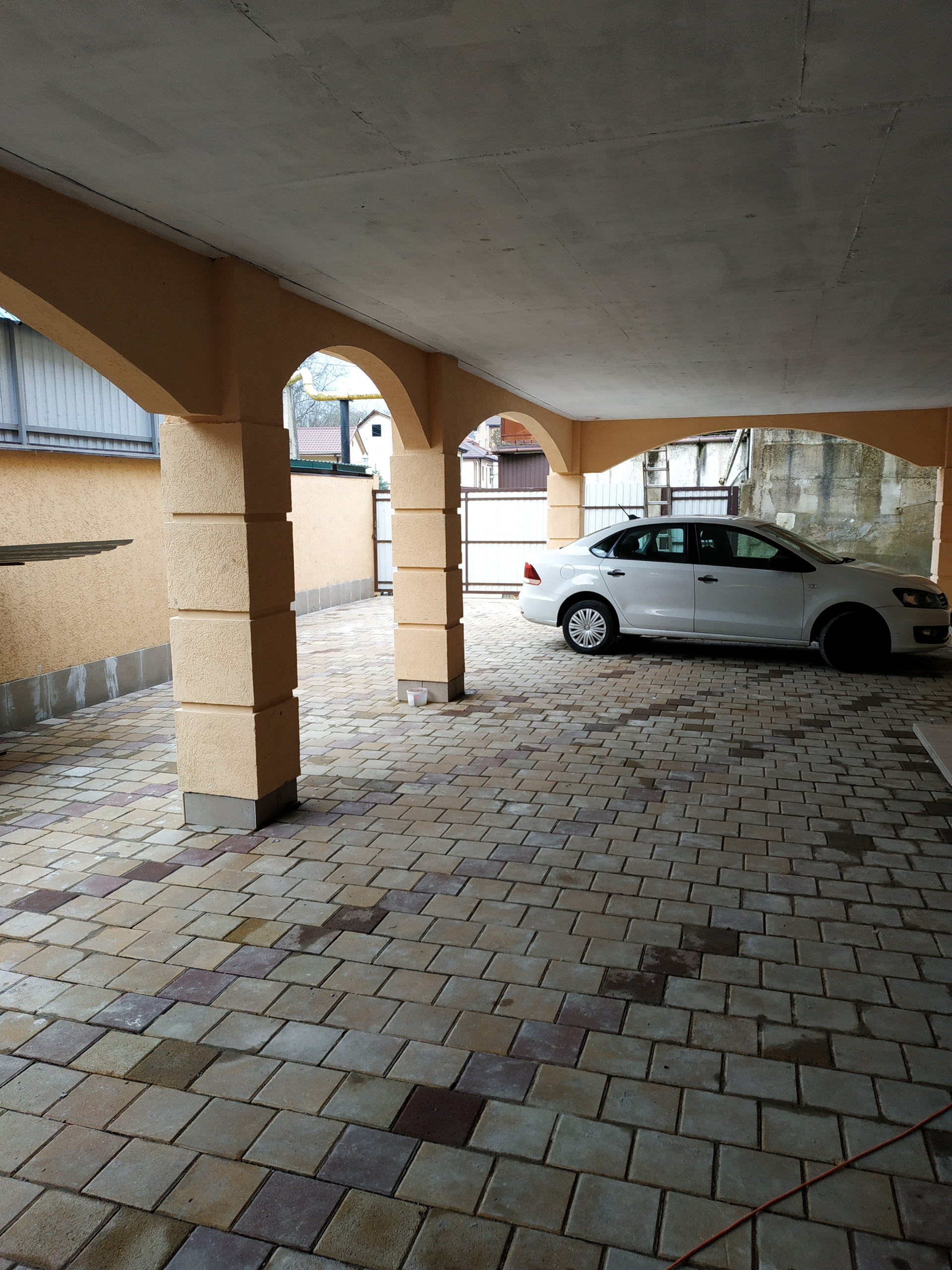 Крытая парковка под балконом дома (до 4 автомобилей), перед воротами еще 1 парковка.