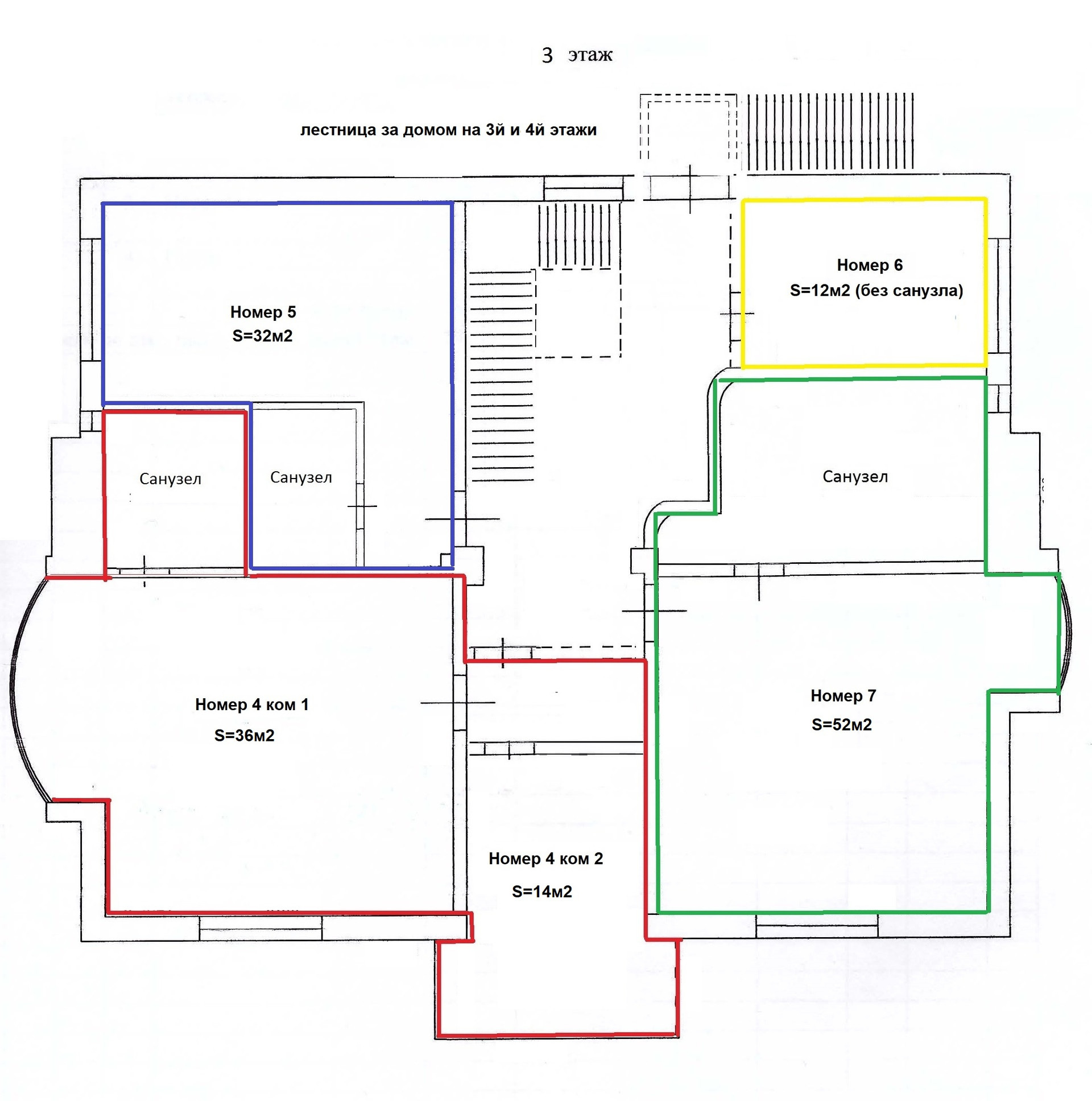 3 этаж - 3 номера (двухкомнатный 50м2 с эркером, студия-люкс 50м2 с эркером + большой ванной комнатой 20м2, студия-эконом 32м2 с санузлом), комната без с/у, коридор 40м2.