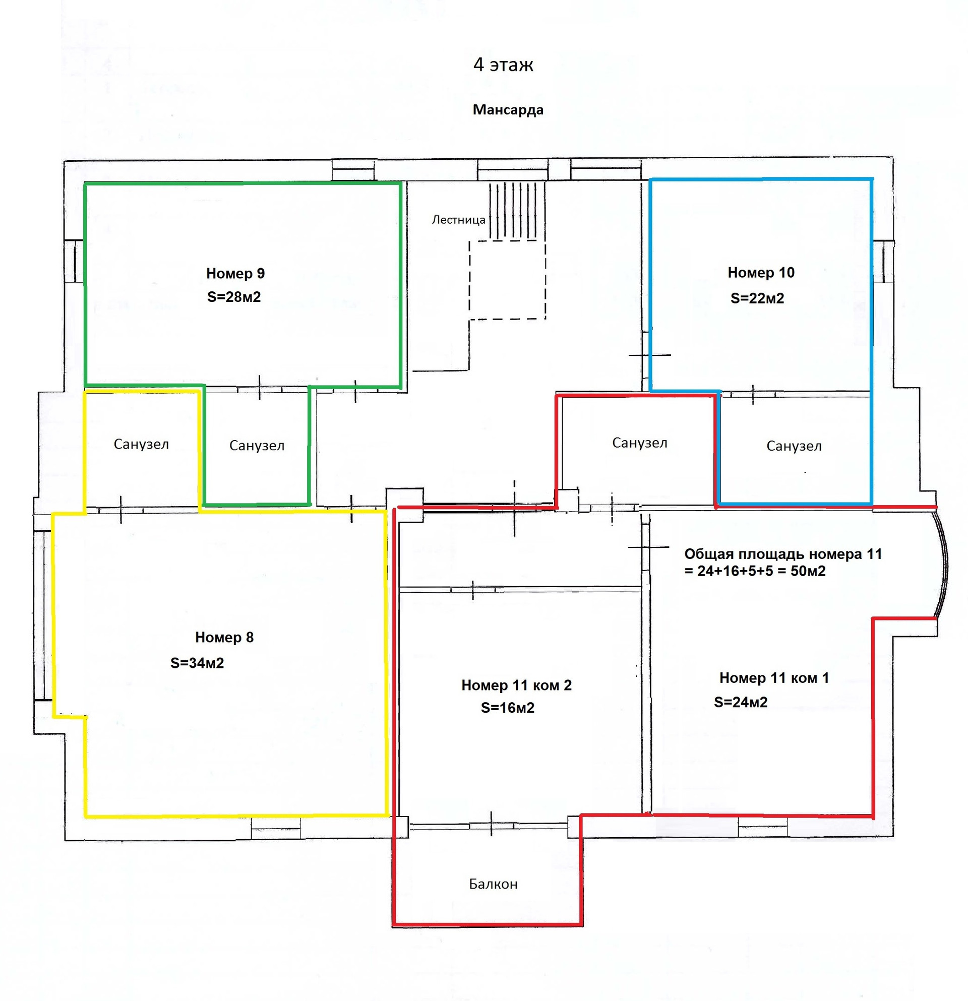4 этаж 4 номера эконом, в т.ч. один 2-х комнатный с балконом и эркером (36м2 + 50м2 + 32м2+ 22м2) + коридор.