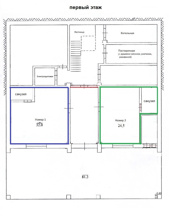 1 этаж - 2 номера (32 м2 + 24м2), санузел, бойлерная, кухня, кладовая, коридор.