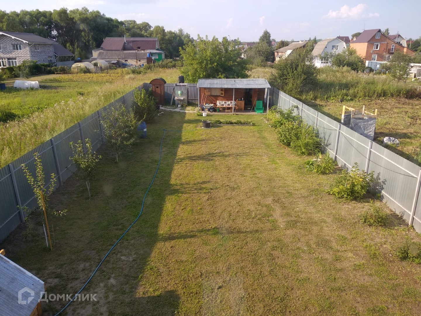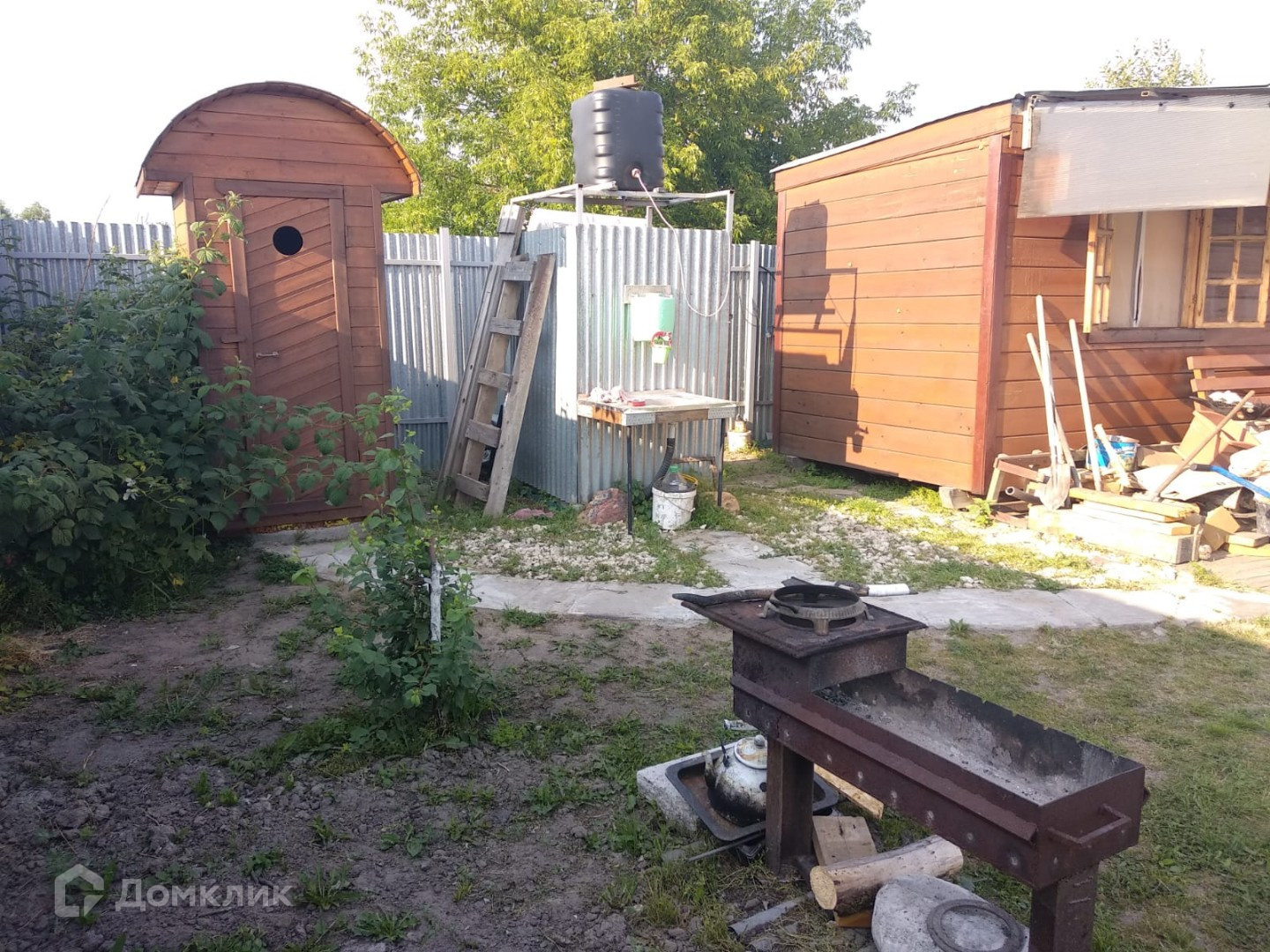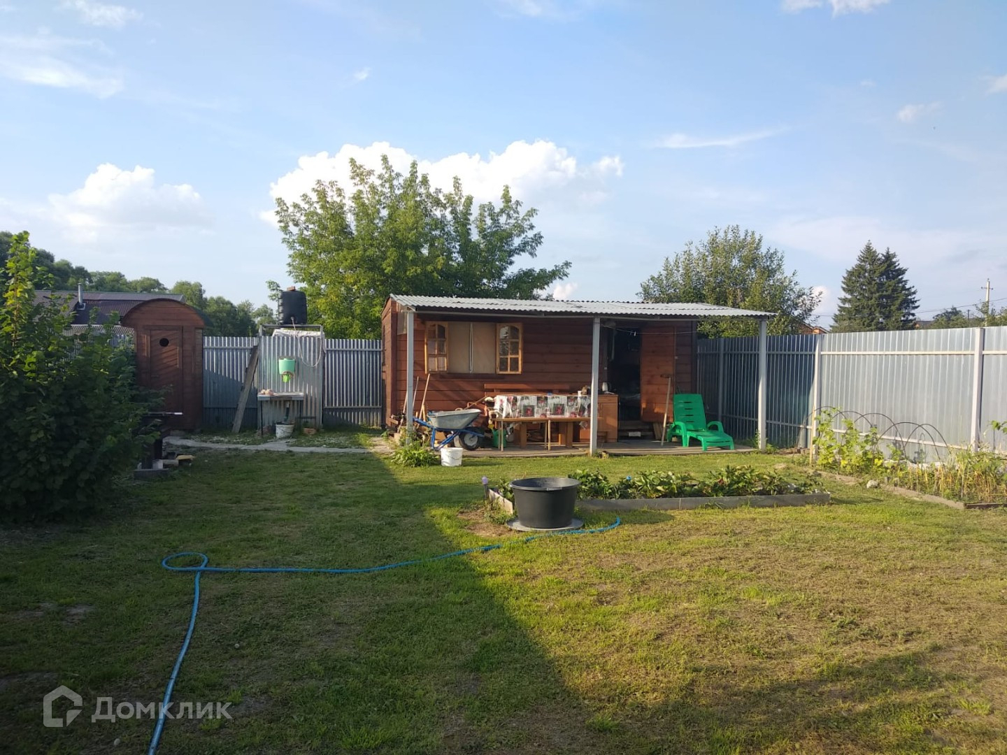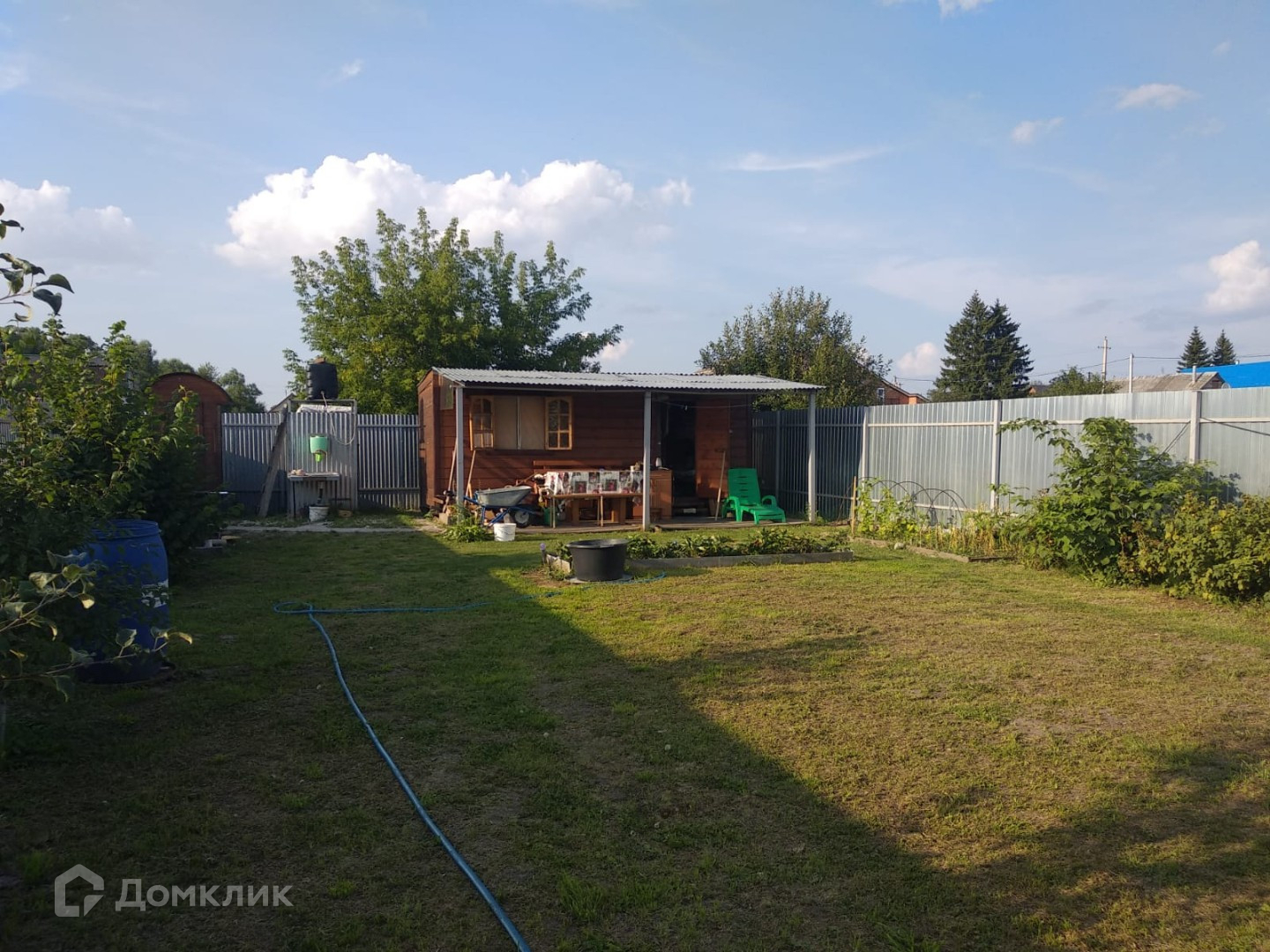 Участок ровный ухоженный, огорожен забором, на котором установлены бытовка (обустроен как летний домик: три кровати+обеденная зона, терраса) туалет и летний душ, колодец. Молодые насаждения на участке - плодовые деревья, ягоды, цветы.