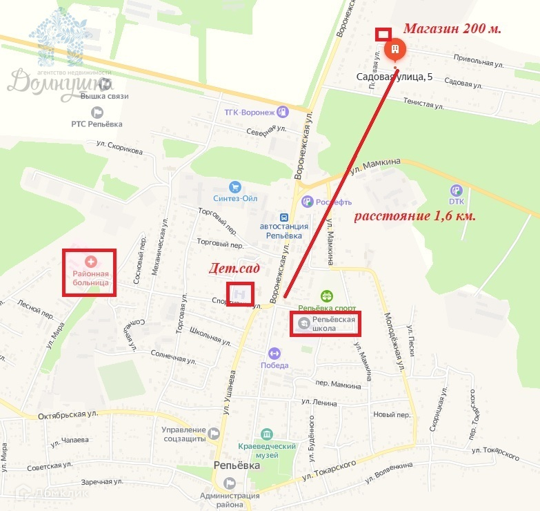 Село является районным центром, соответственно со всей инфраструктурой. В 200м. есть магазин формат "у дома". В центральной части поселка, в расстоянии 1.6 км. : школа, дет. сад, торговый центр, спортивный комплекс, поликлиника, больница с большим количеством узких специалистов.