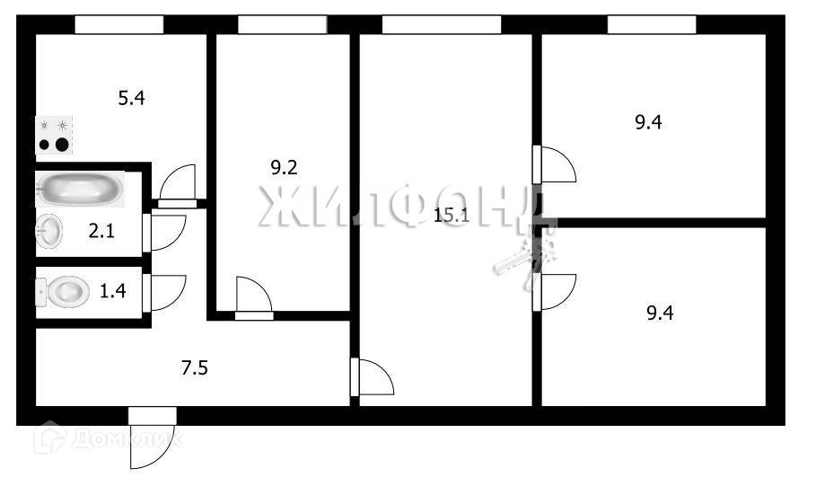 Коридор 7,5 кв.м, раздельный с.у, кухня 5,4 кв.м., 4 жилых комнаты (9,2.,  15,1.,  9,4., 9,4 кв.м.). Окна ПВХ.