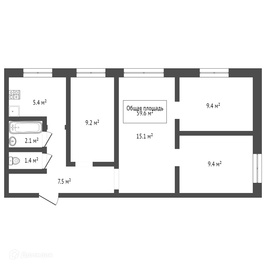 Общая площадь 59.6 м2