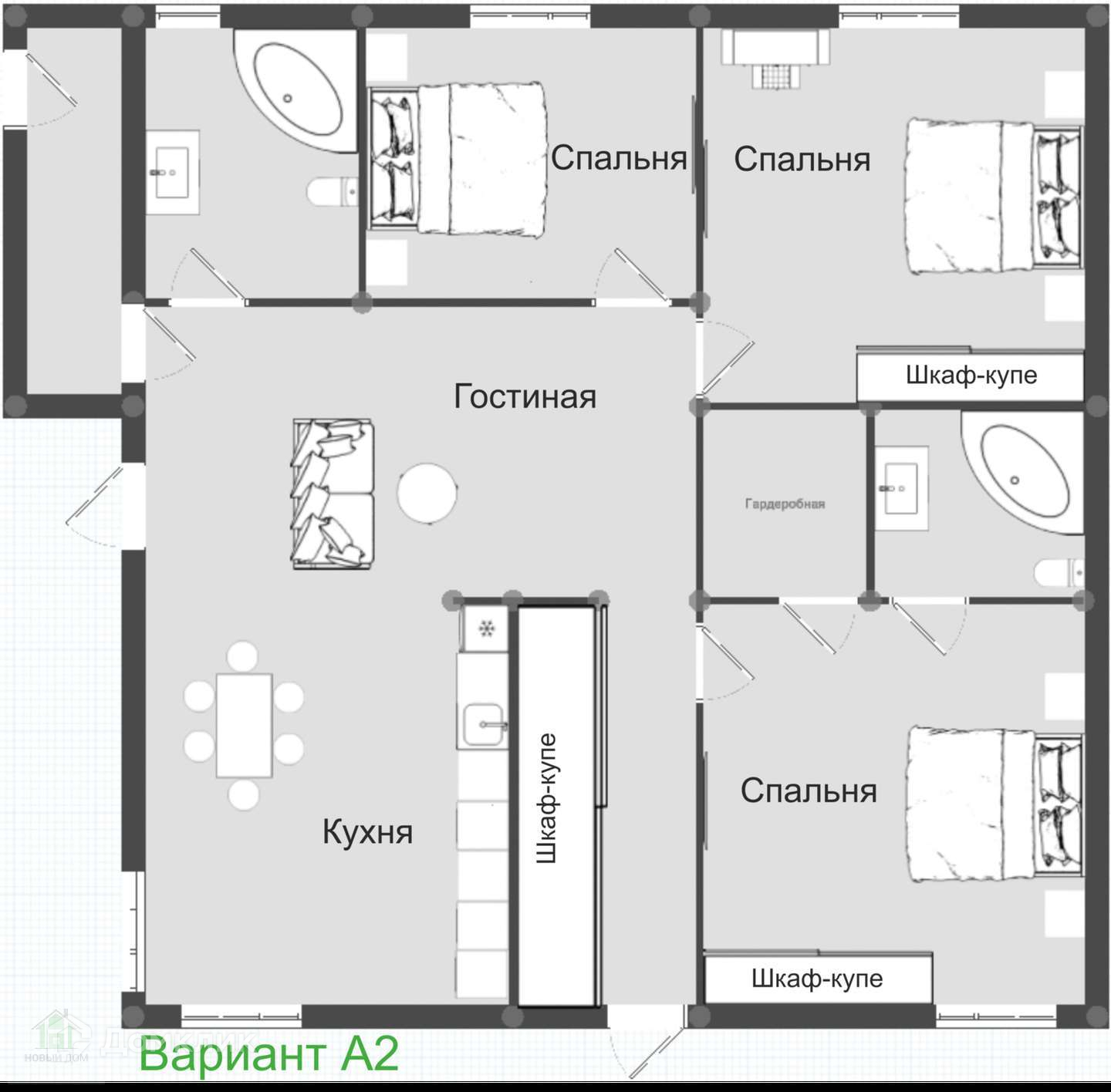 В доме 3 спальных комнаты. В одной из спален есть отдельная гардеробная и ванная комната.