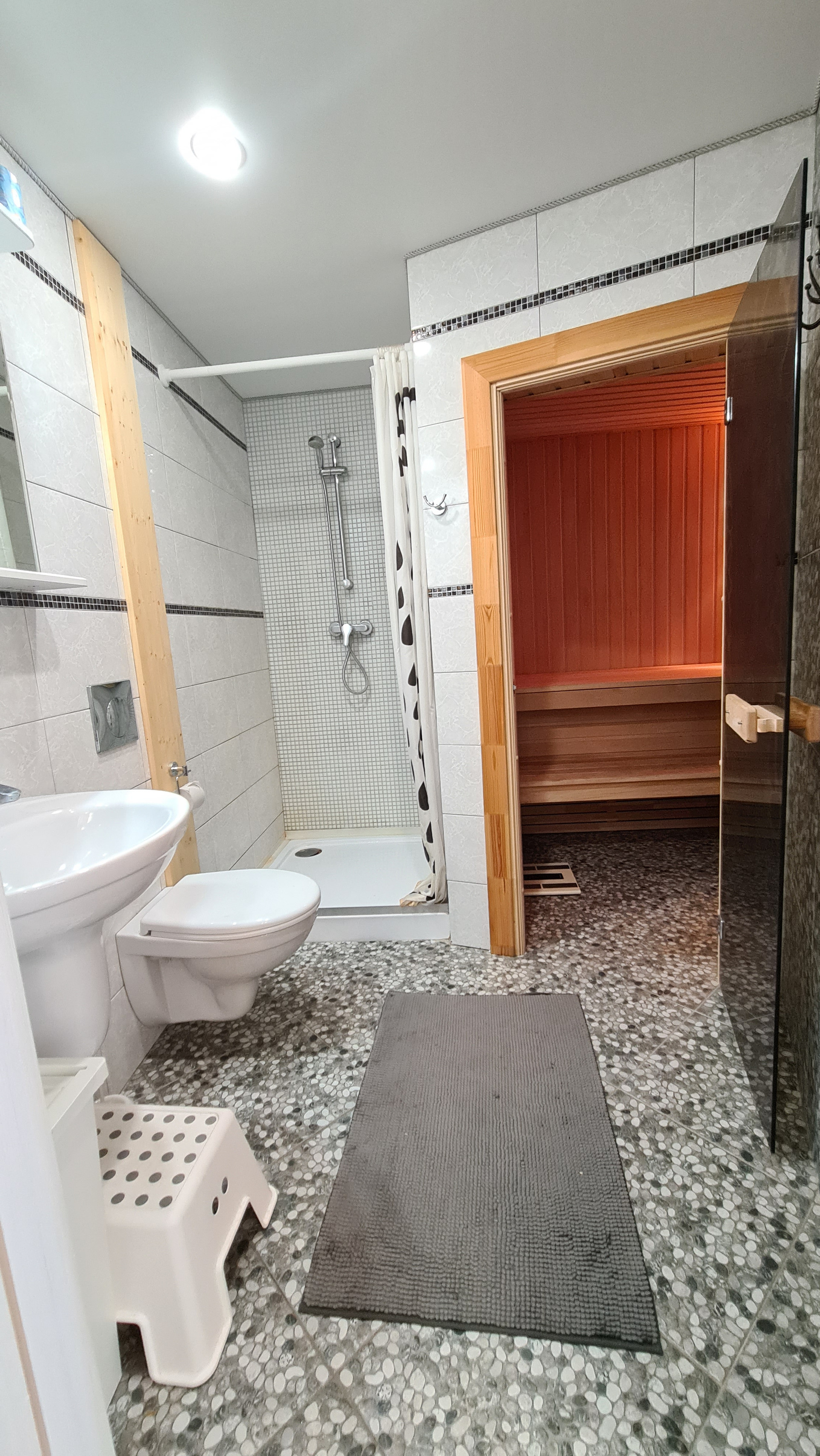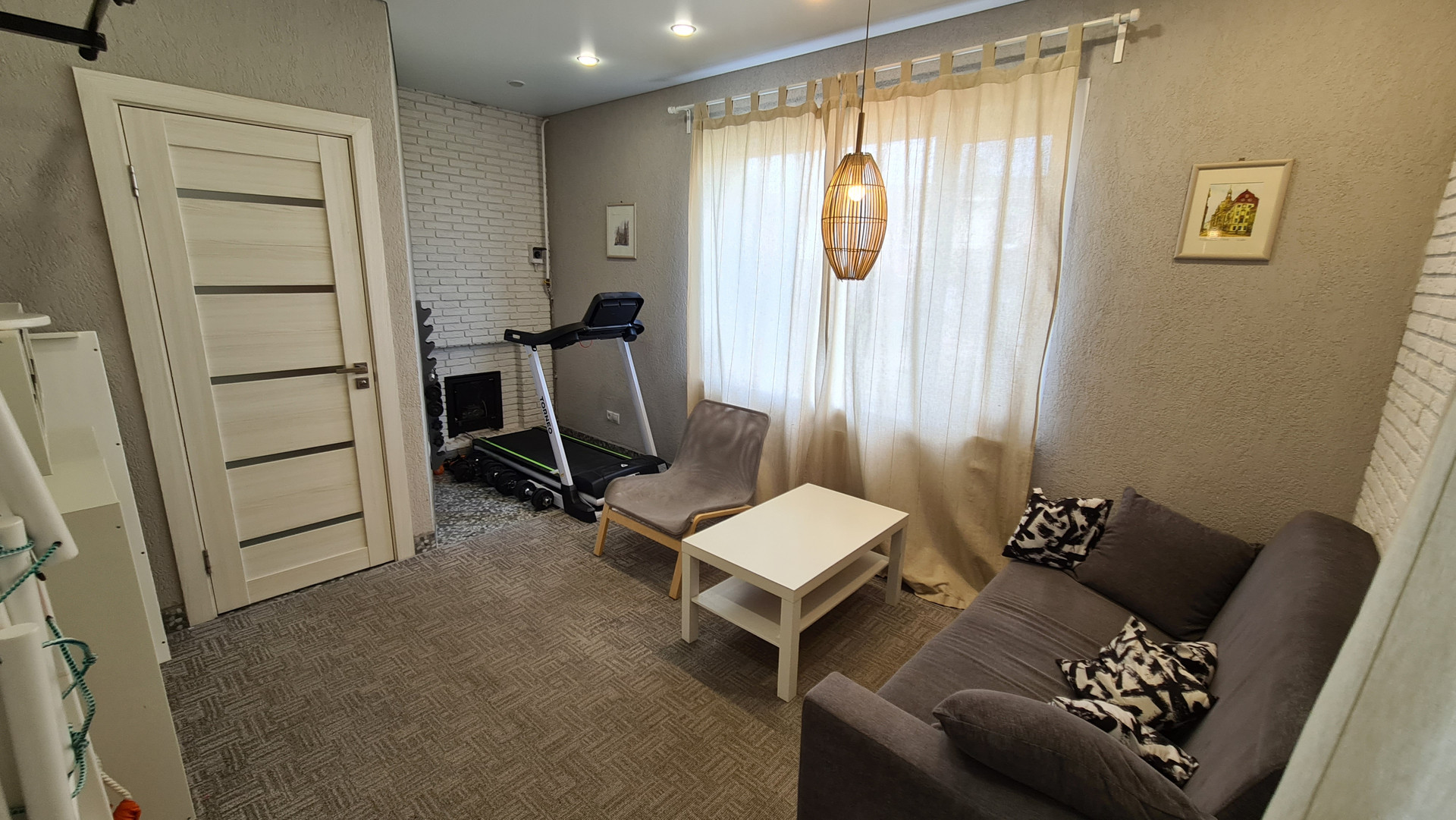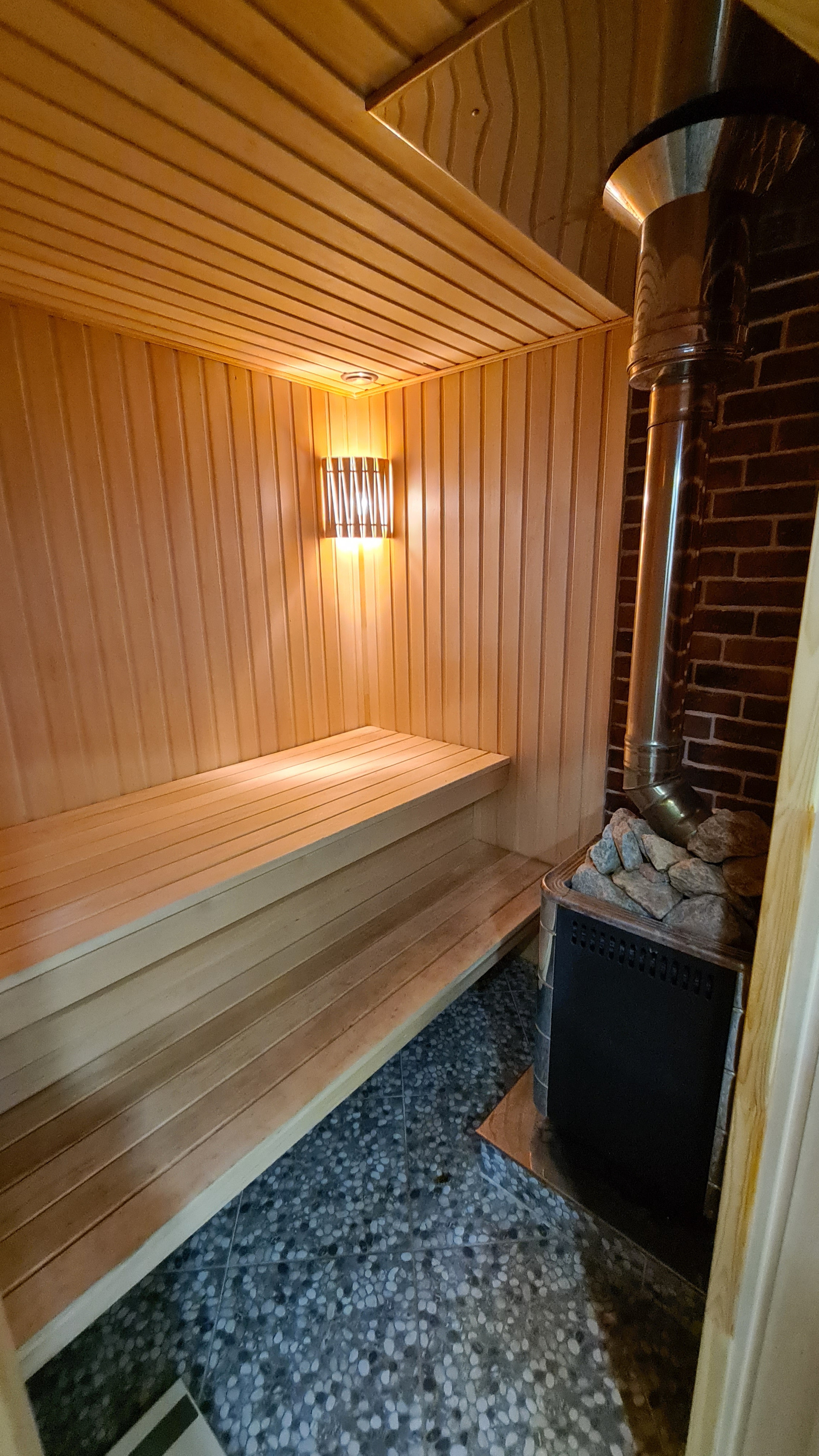 На первом этаже прихожая, кладовая, спальня, САУНА со спортзалом(комнатой отдыха), душевая с санузлом, просторная гостиная с совмещенной кухней и с выходом на веранду и к беседке. На всем первом этаже теплые полы.