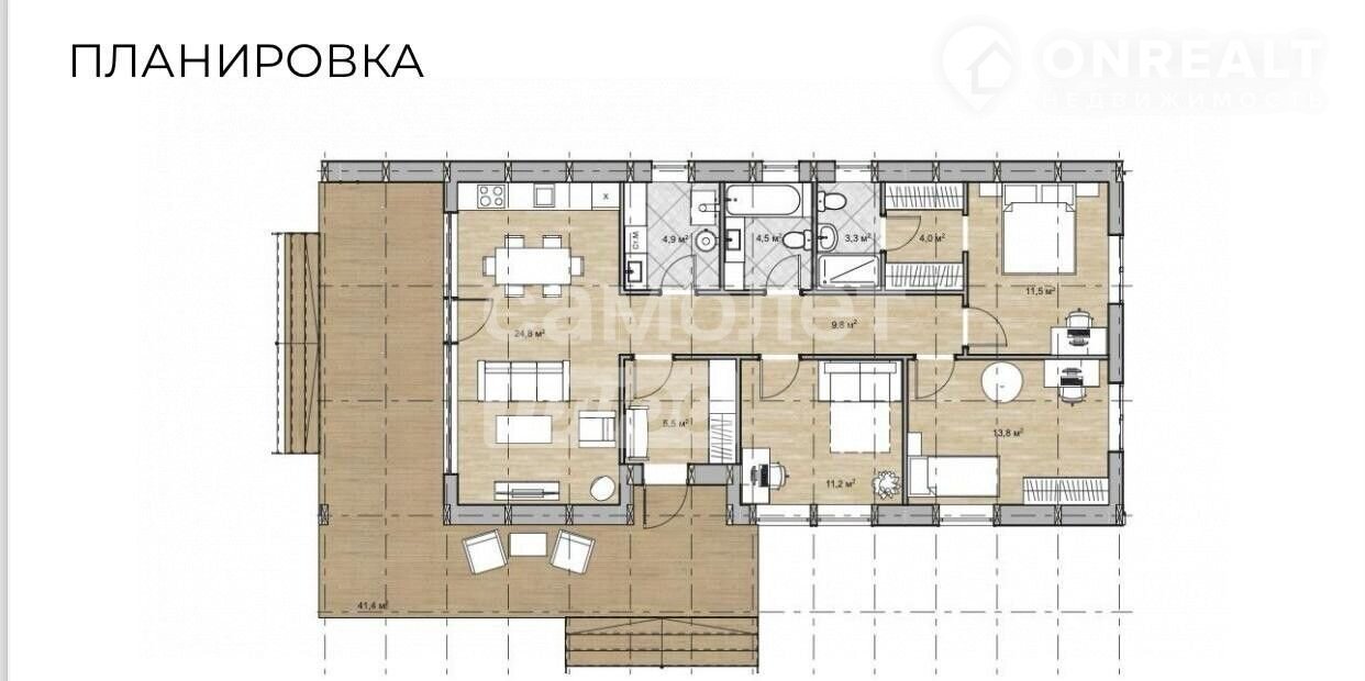 Oбщая плoщадь дома 120 кв.м. Продуманная планировка дома, кухня-гостиная, 3 комнаты, гардеробная, 2 санузла.