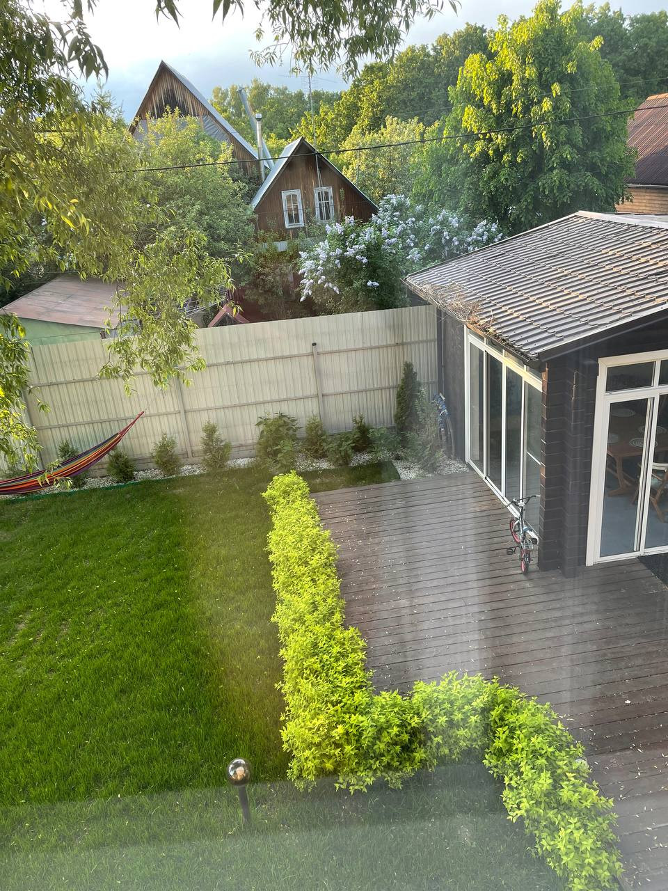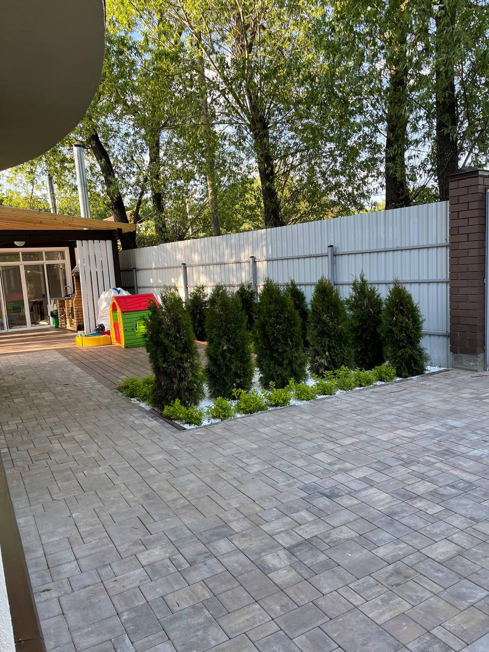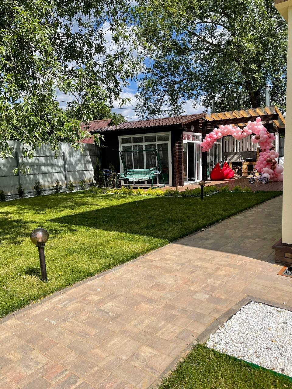 Участок полностью благоустроен - зелень, каминная зона, беседка.