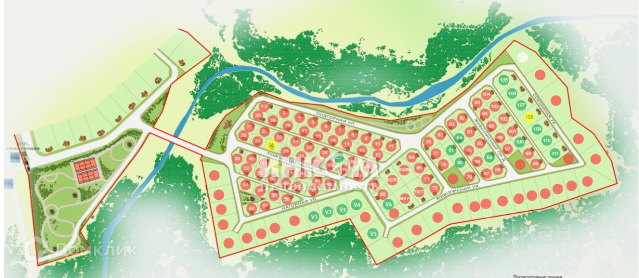 Территория поселка благоустроена (дороги, озеленение, освещение), расположено несколько современных детских площадок, два теннисных корта. Большая прогулочная зона со скверами и парками. Поселок заселен на 80%.