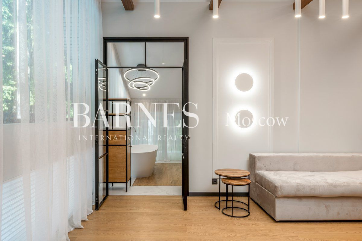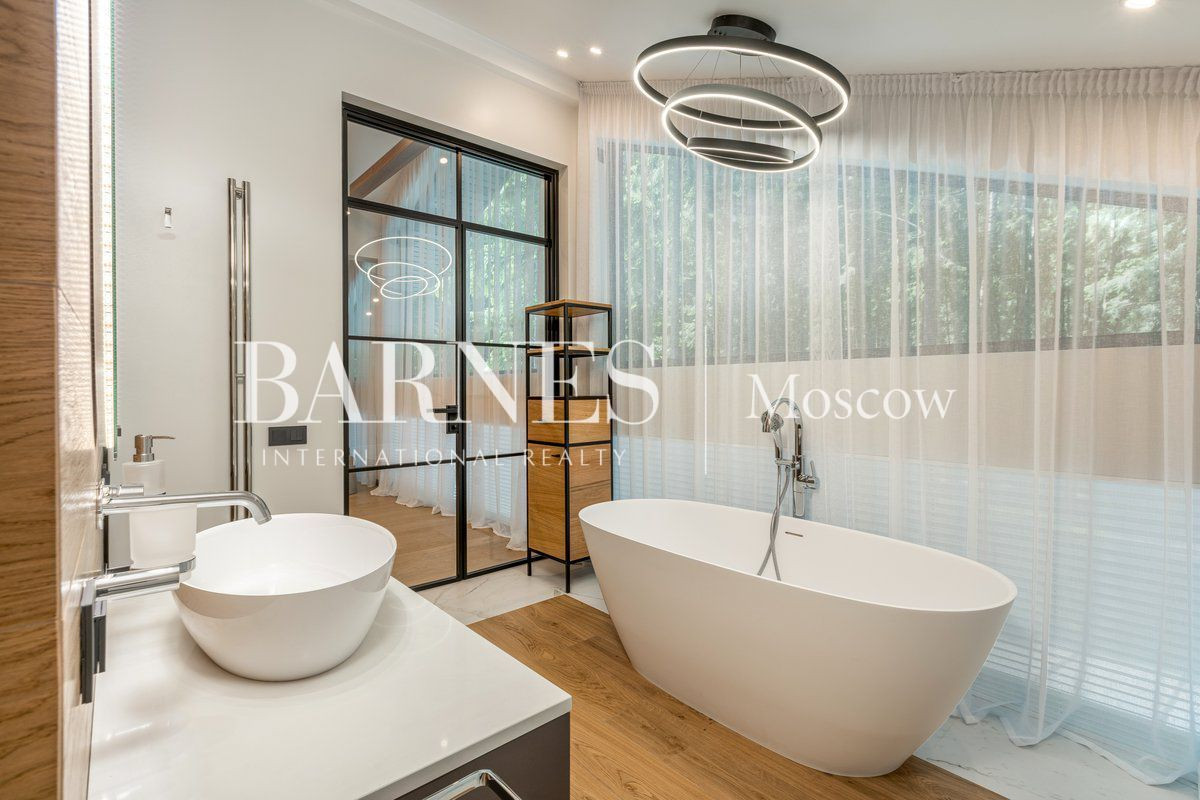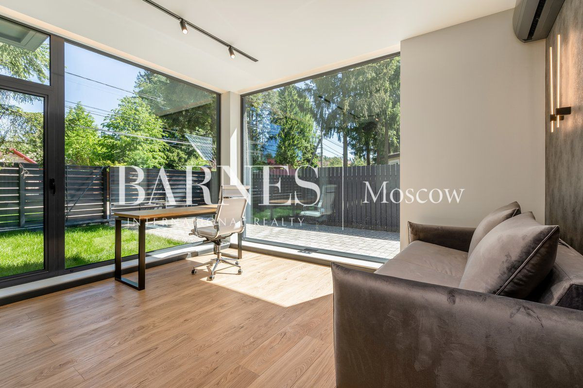На первом этаже: просторный холл, светлая гостиная, совмещенная со столовой зоной, уютная кухня, практичный кабинет, а также санузел, вместительная гардеробная и котельная. На придомовой территории имеется терраса для отдыха на свежем воздухе.