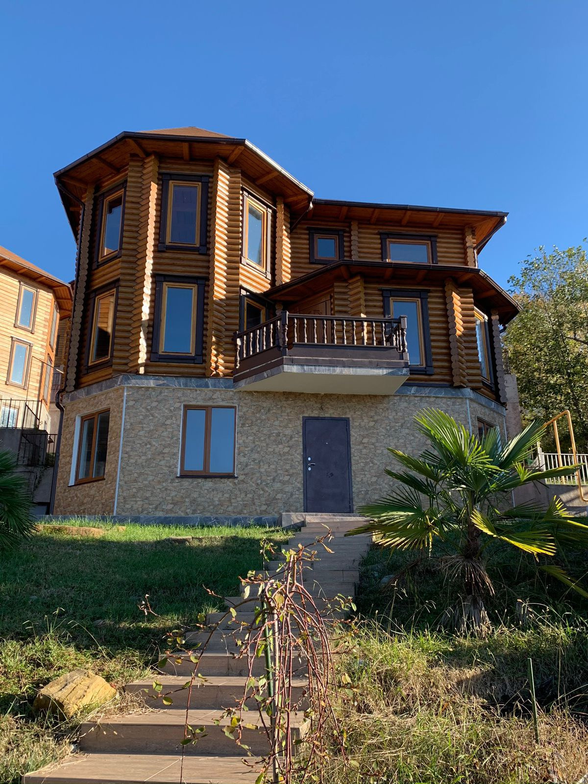 Во дворе дома предусмотрено место для парковки, а участок позволяет с боку дома оборудовать зону барбекю и даже установить летний бассейн. Территория дома облагорожена, растет прекрасная большая туя, и конечно же пальмы, куда в Сочи без пальм? Высеян зеленый газон, а к дому ведут комфортные не крутые ступени.