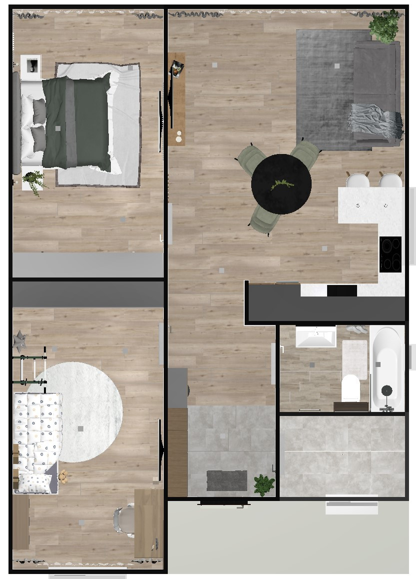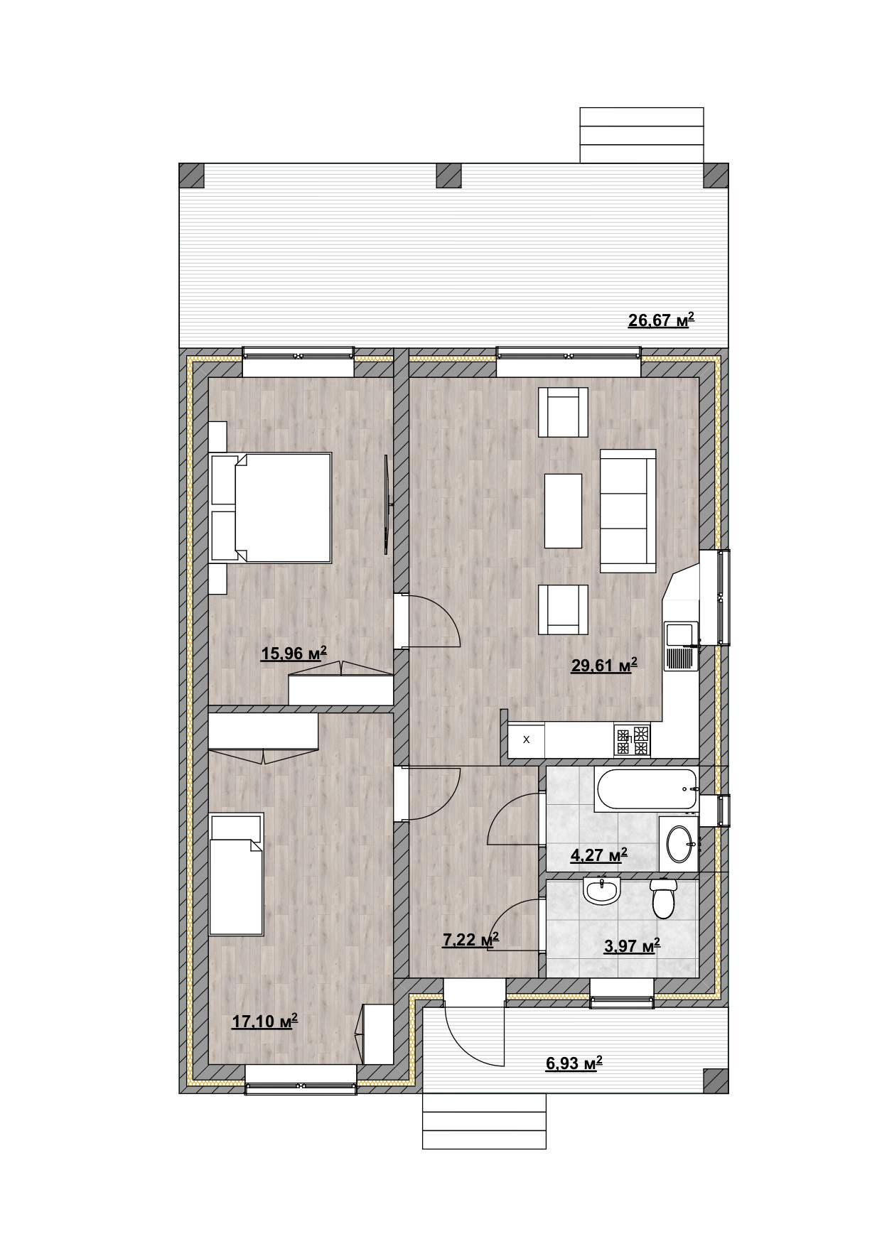 ПРОЕКТ: ДВЕ спальни, Светлая кухня — гостиная, санузел, холл, котельная, тамбур, терраса.