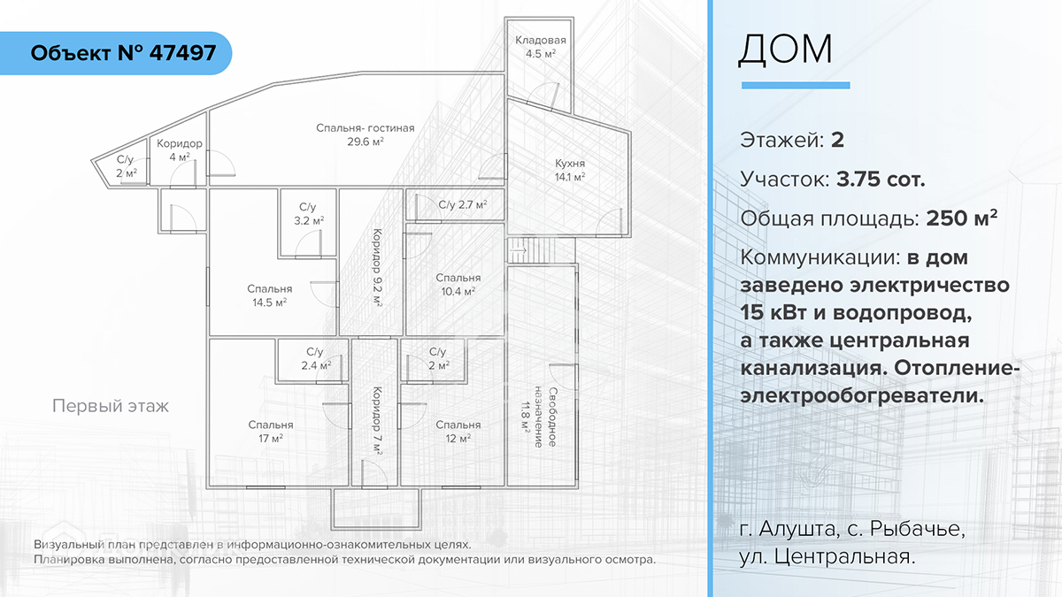 Продается жилой дом в городе Алушта, село Рыбачье, улица Центральная. Дом общей площадью 250 м2. Земельный участок площадью 3,75 соток. Вид разрешенного использования – индивидуальное жилищное строительство.