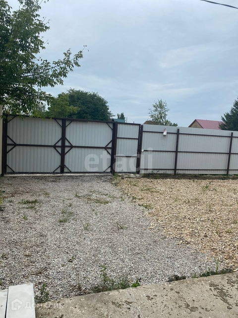 Новый забор из металлопрофиля, перед домом просторное место для парковки нескольких машин.
