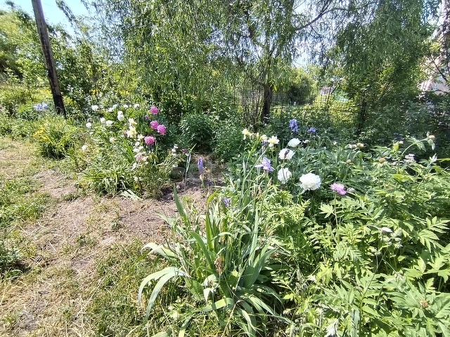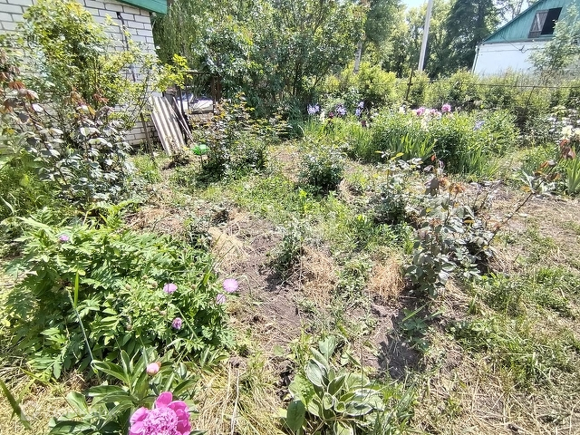 На участке много плодово-ягодных насаждений, цветов.