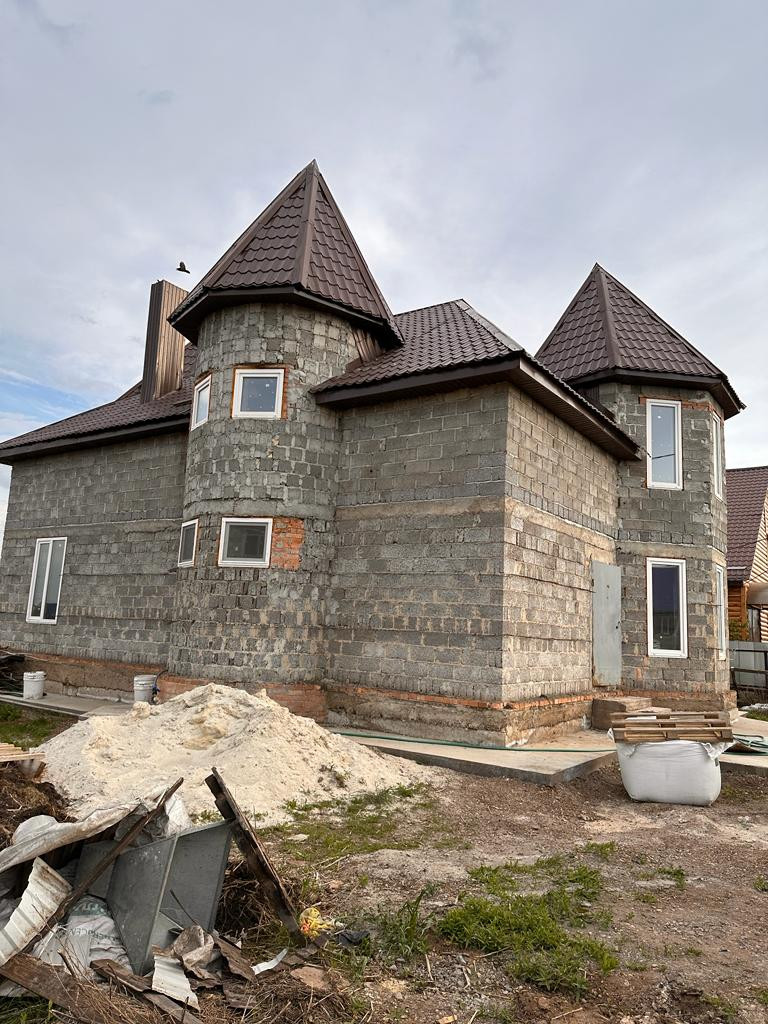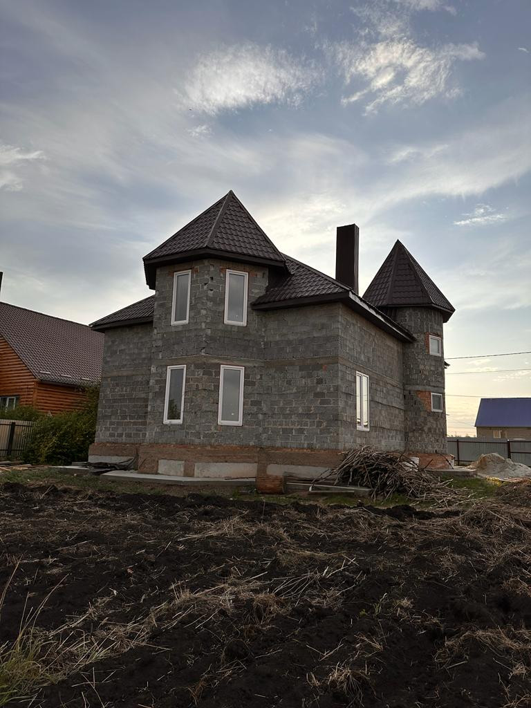 Продаётся дом с красивым проектным решением, 2 этажа, 220кв, 17 соток, строился только из качественных материалов для собственного проживания, в доме имеется электричество, водоснабжения, водоотведение, газификация на этапе подведения. В доме черновая отделка, пол заливной бетонный, в доме имеется погреб, лестница из металлокаркаса, потолок из гипсокартона, стены оштукатурены, окна пластиковые
