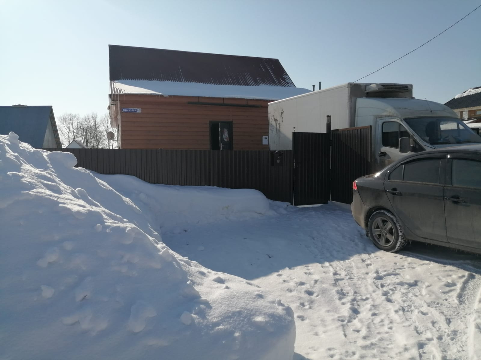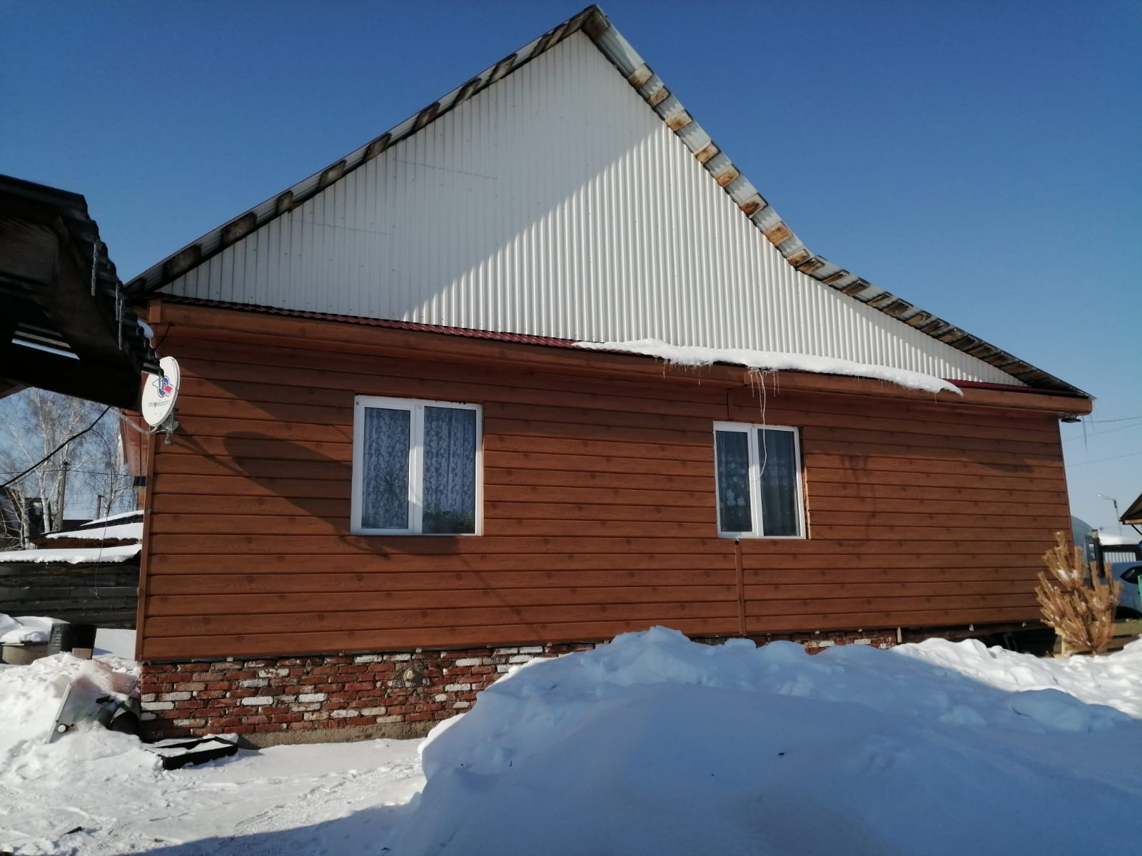 Дом из бревна, обшитый сайдингом, крыша и заборы профнастил.