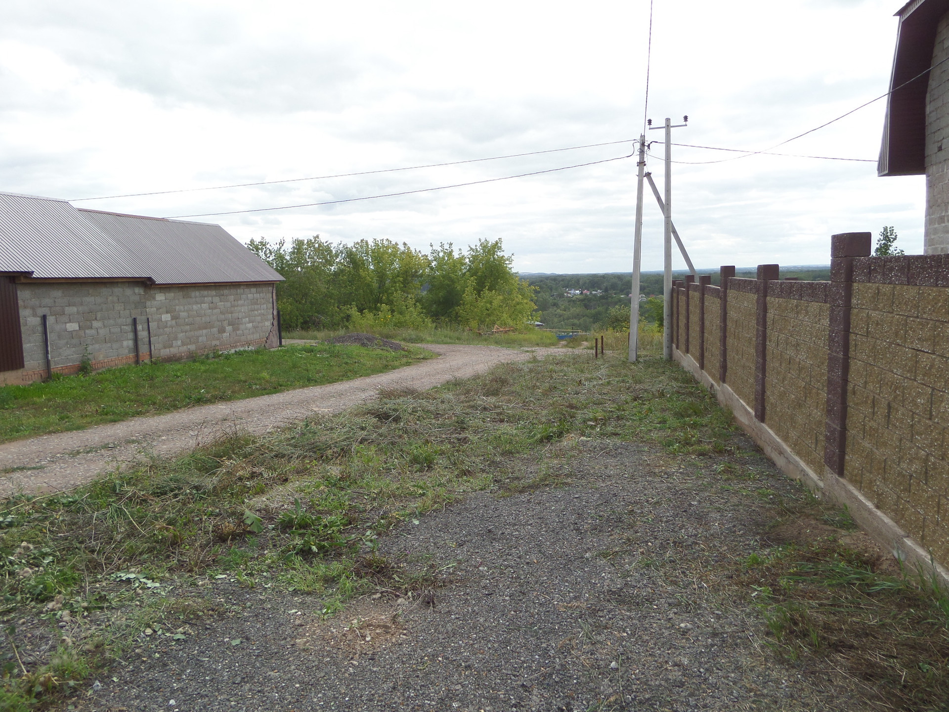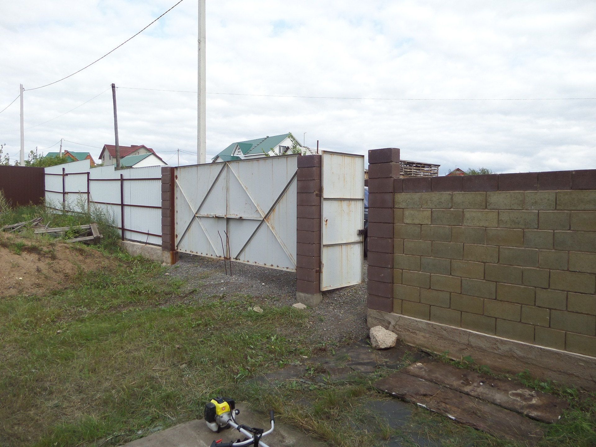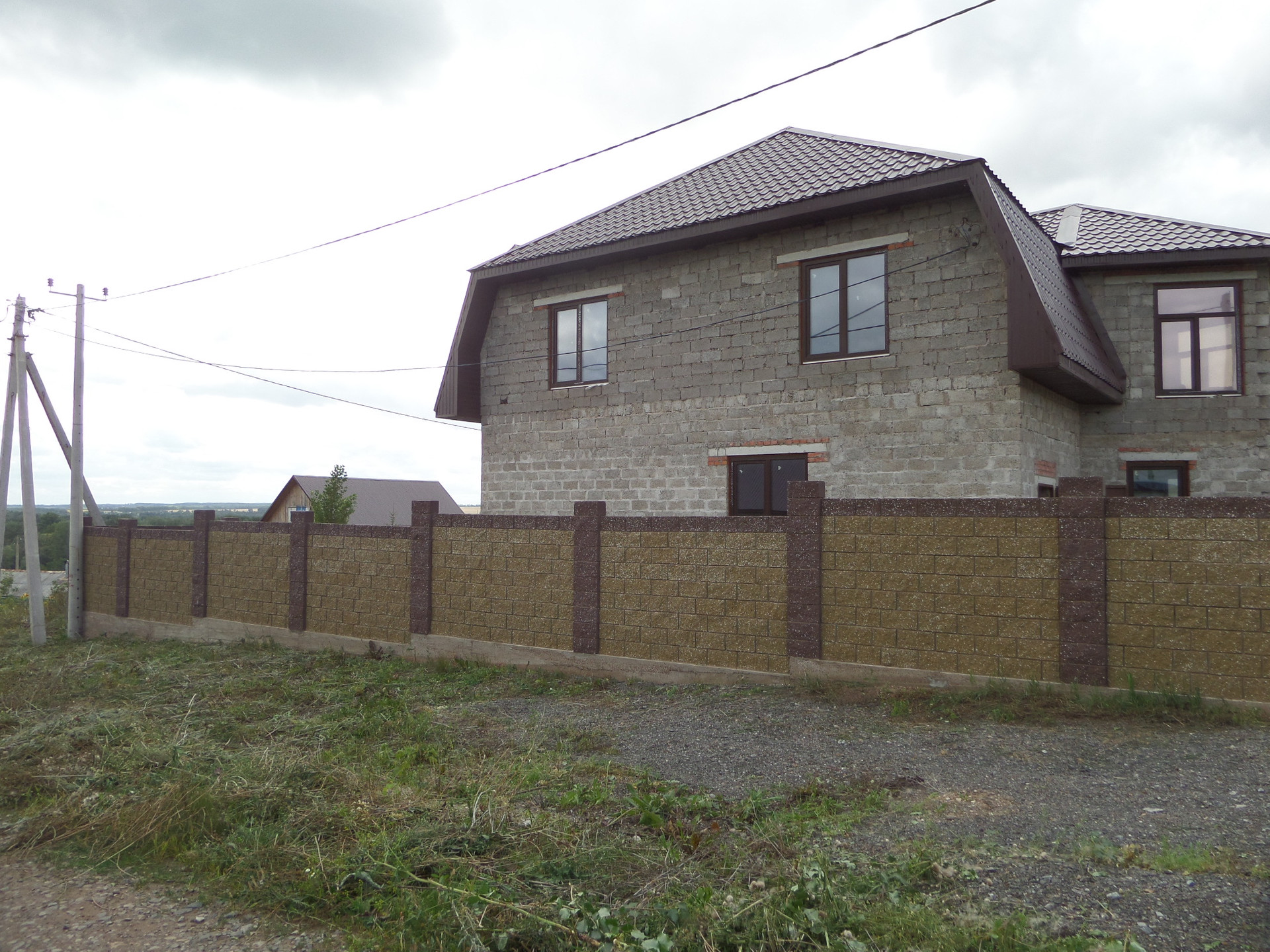 Ограждение на фундаменте, двухстороннее из бессерных блоков и профнастила.