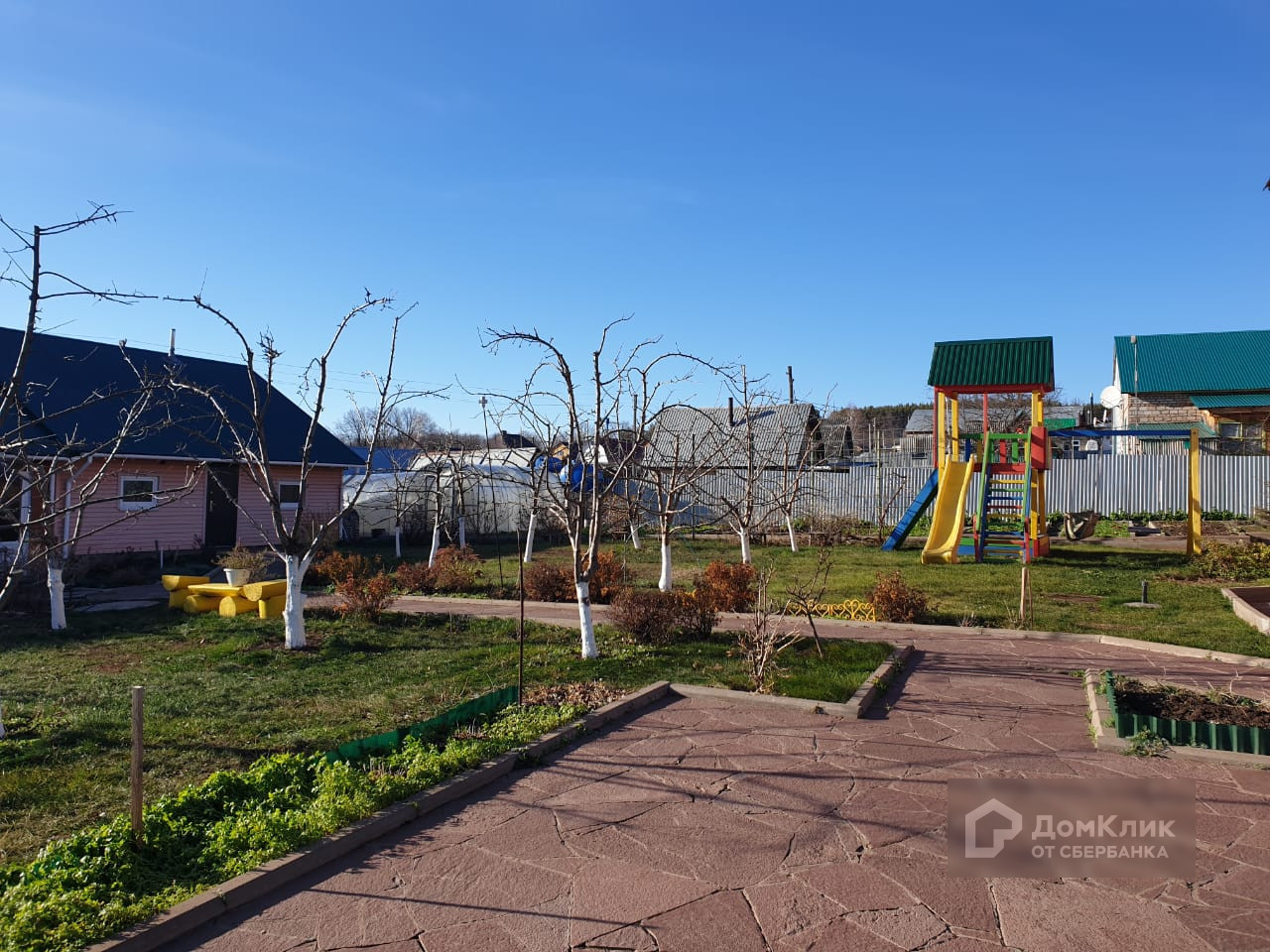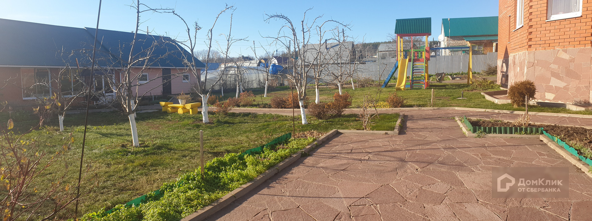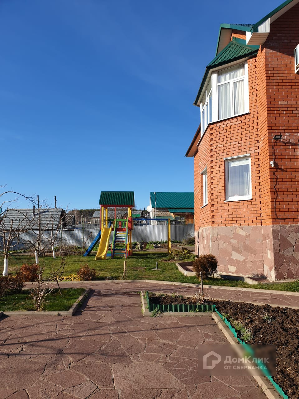 Территория вокруг дома и дорожки выложены брусчаткой, забор по периметру участка.
