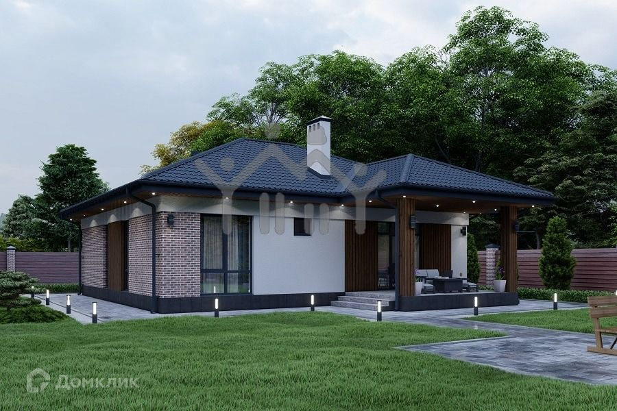 Стильный  одноэтажный дом с продуманной планировкой отлично подойдет для семьи из 4-5 человек. Главной особенностью этого дома является гостиная с просторной террасой для летнего отдыха, при желании которую можно будет застеклить и пользоваться данное пространство в зимний период времени..