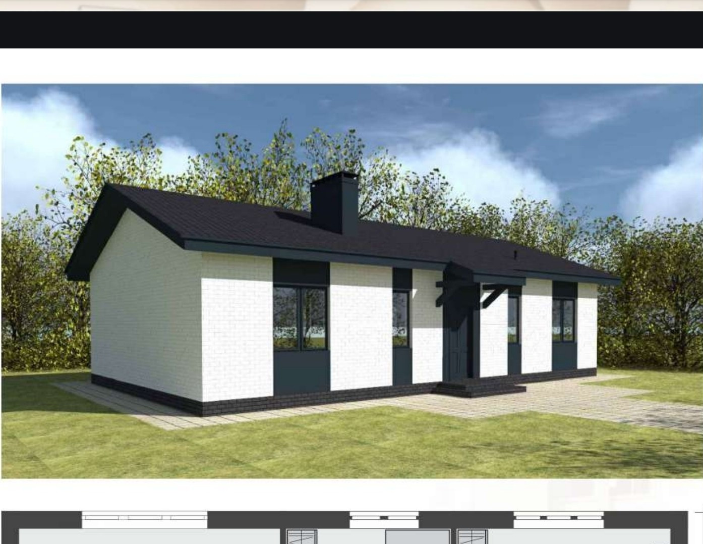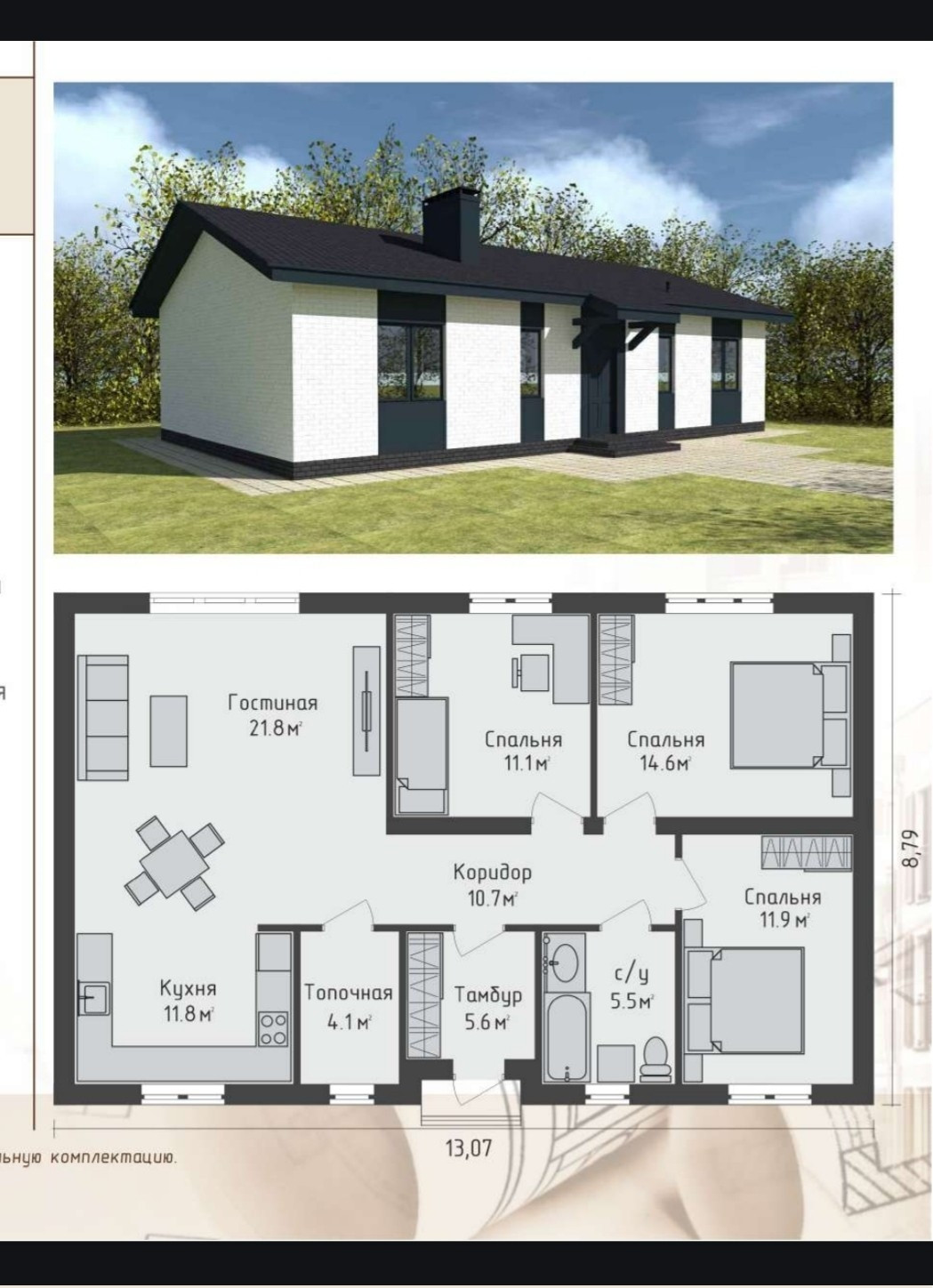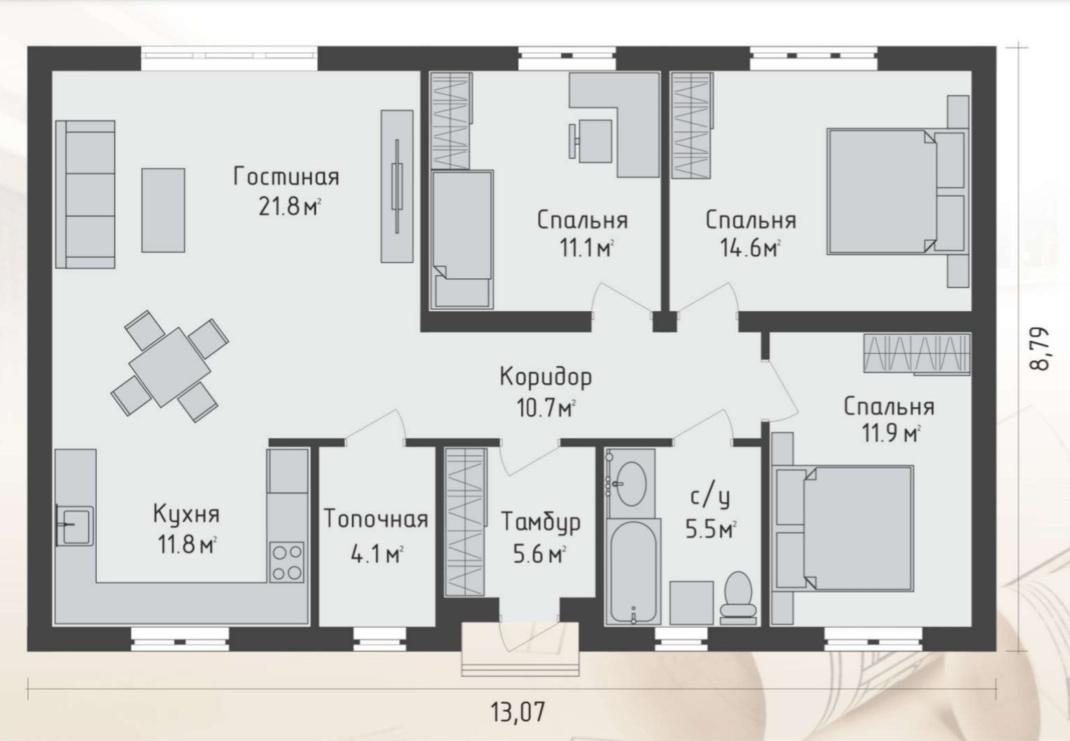 Площадь общая 96м2. В доме 3 изолированные спальни, санузел, большая кухня-гостинная с витражом и выходом во внутренний двор.