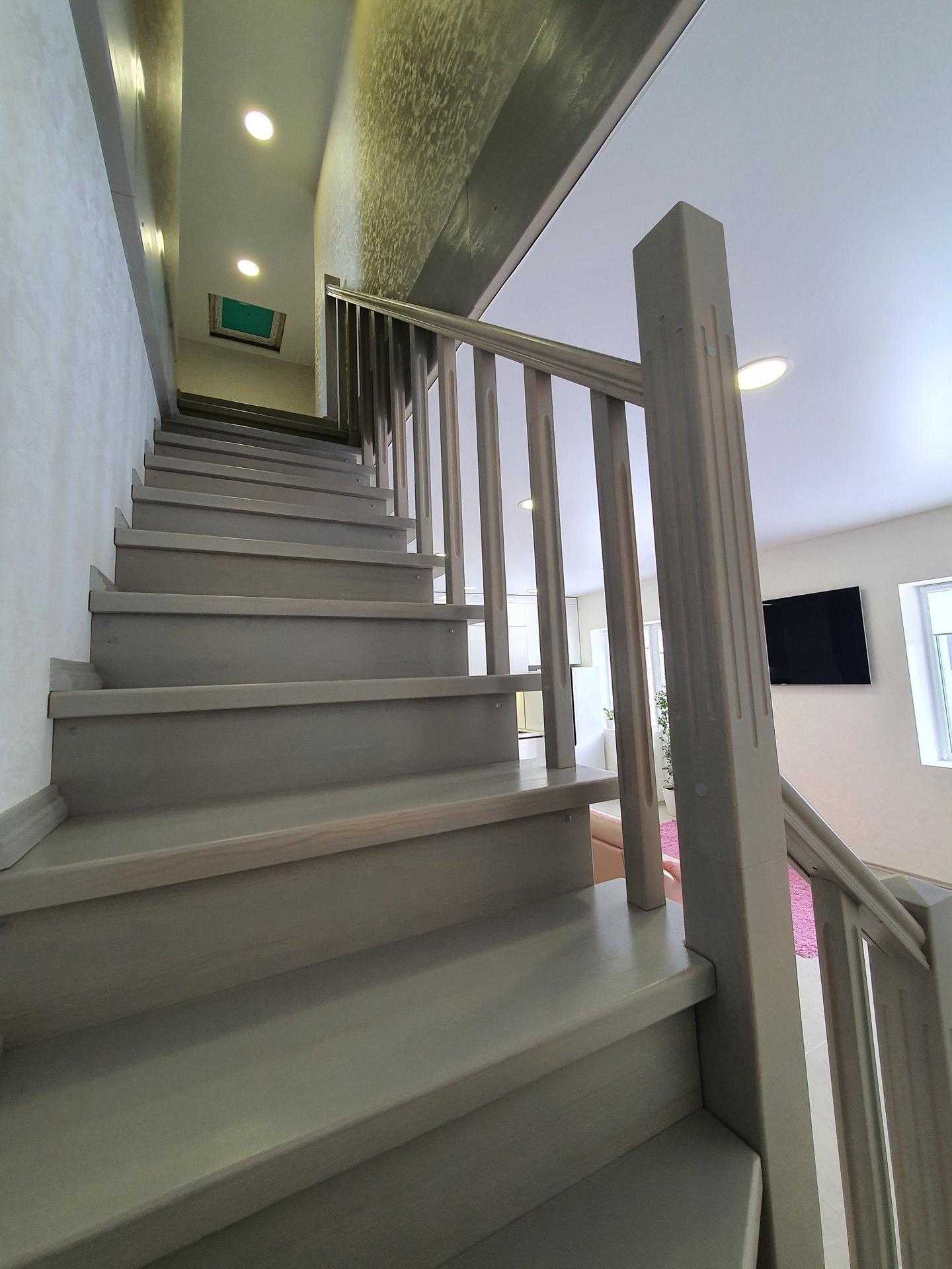 С первого на второй этаж дома ведет массивная лестница с перилами, безопасно и удобно для детей и всех членов семьи.