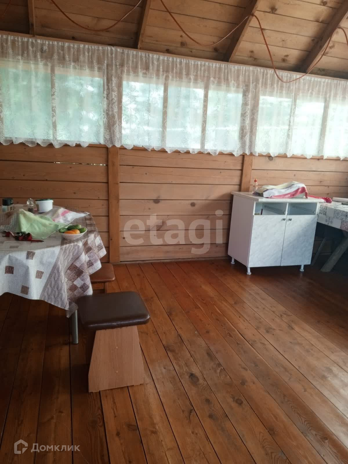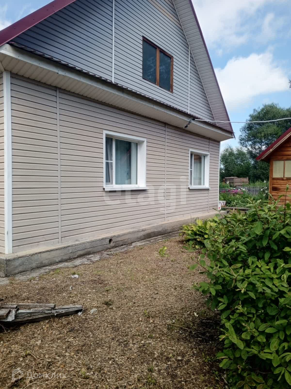 Стены дома построены из лиственного бревна и бруса, утеплены минеральной ватой и обшиты сайдингом. Окна выполнены из пластика.