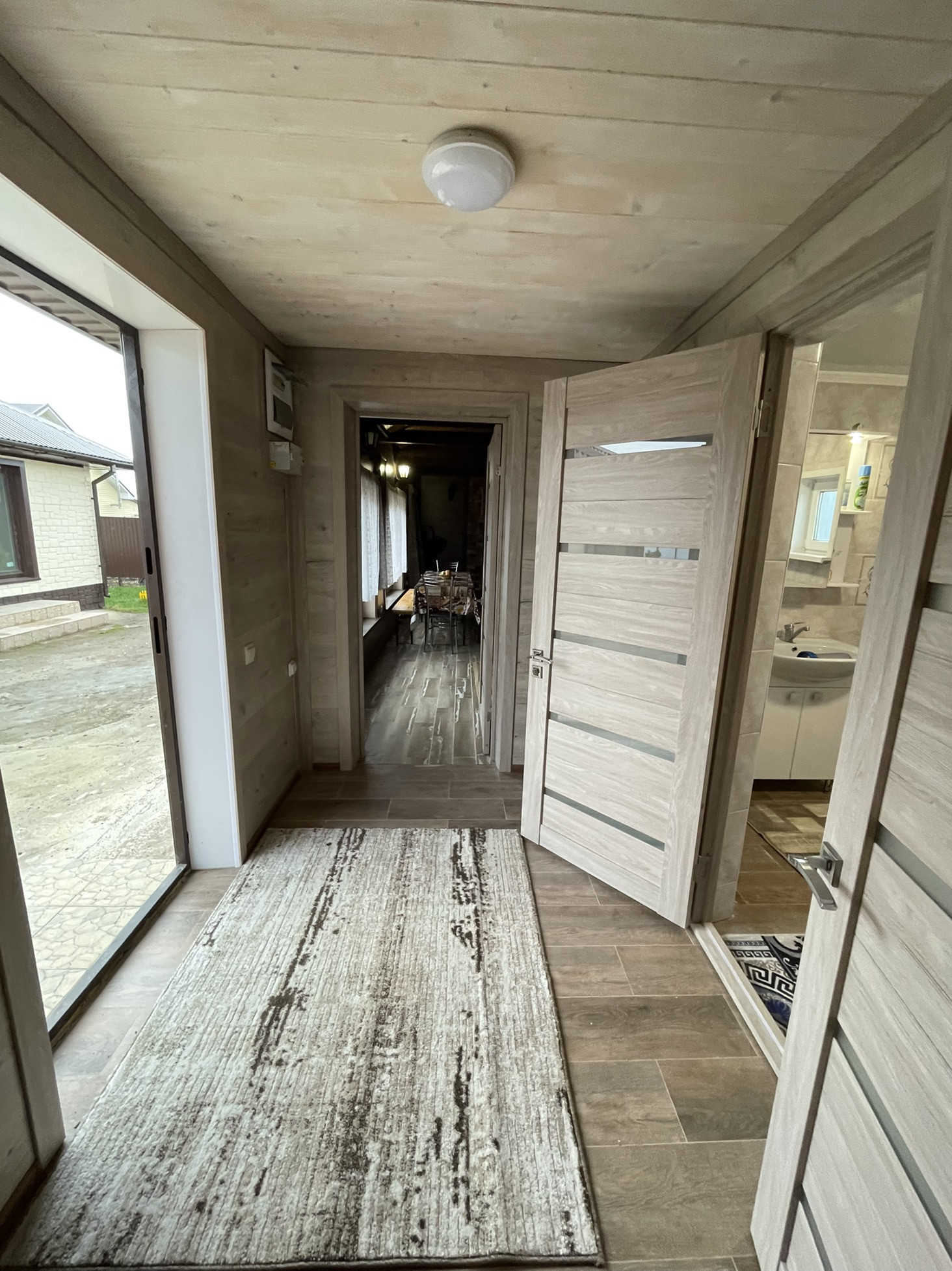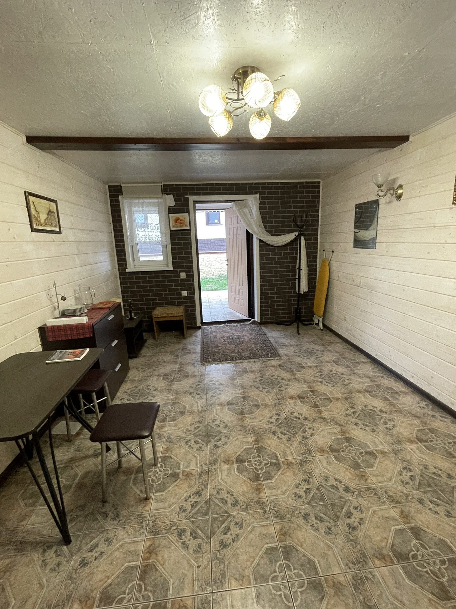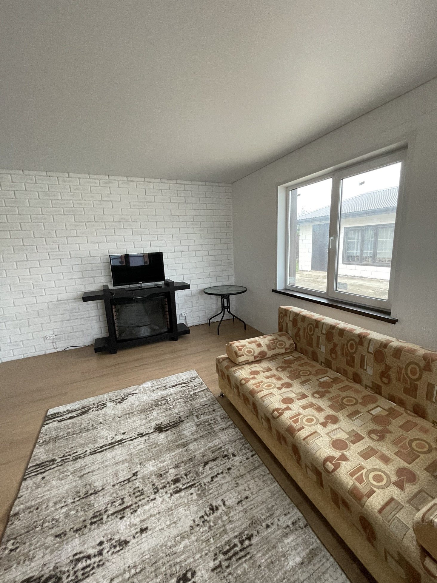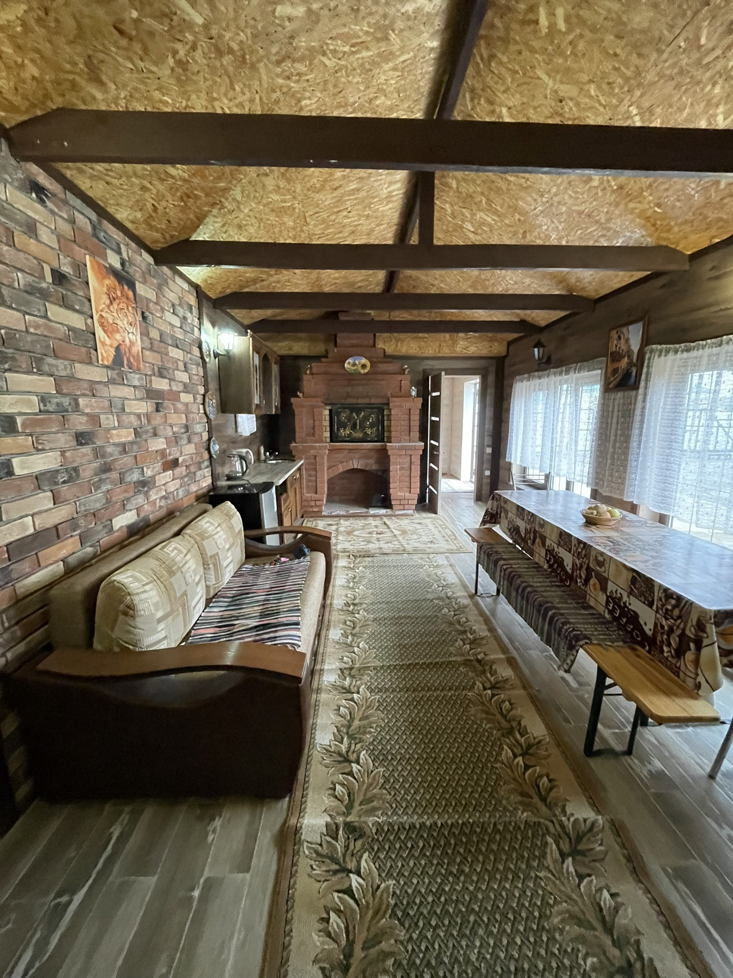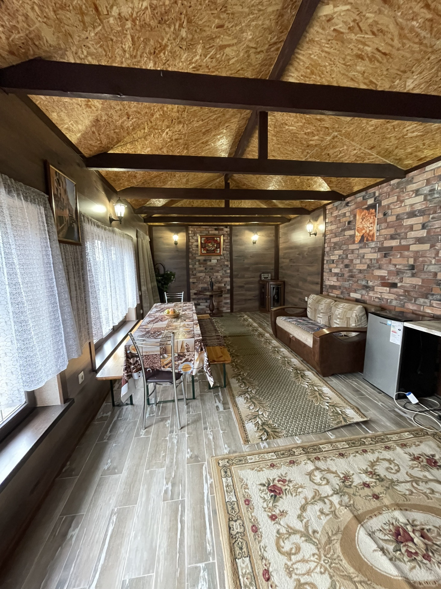 Дом с остеклённой  верандой, просторным санузлом, бойлерной, кухней-гостиной и двумя комнатами. Отопление - тёплый пол (более эффективно чем пристенный обогрев в виде батареи).