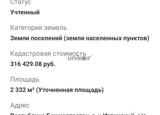 Земельный участок Иглинский р-н, с. Сарт-Лобово, ул. Белая Гора. Предлагаем купить участок в Иглинский р-н, с. Сарт-Лобово, ул. Белая Гора. Огромный участок 12 сот. для застройки жилого дома. Участок расположен в центре . Земельный участок находится в границах населенного пункта, вид разрешенного использования дачное строительство. Тип: земельны... |