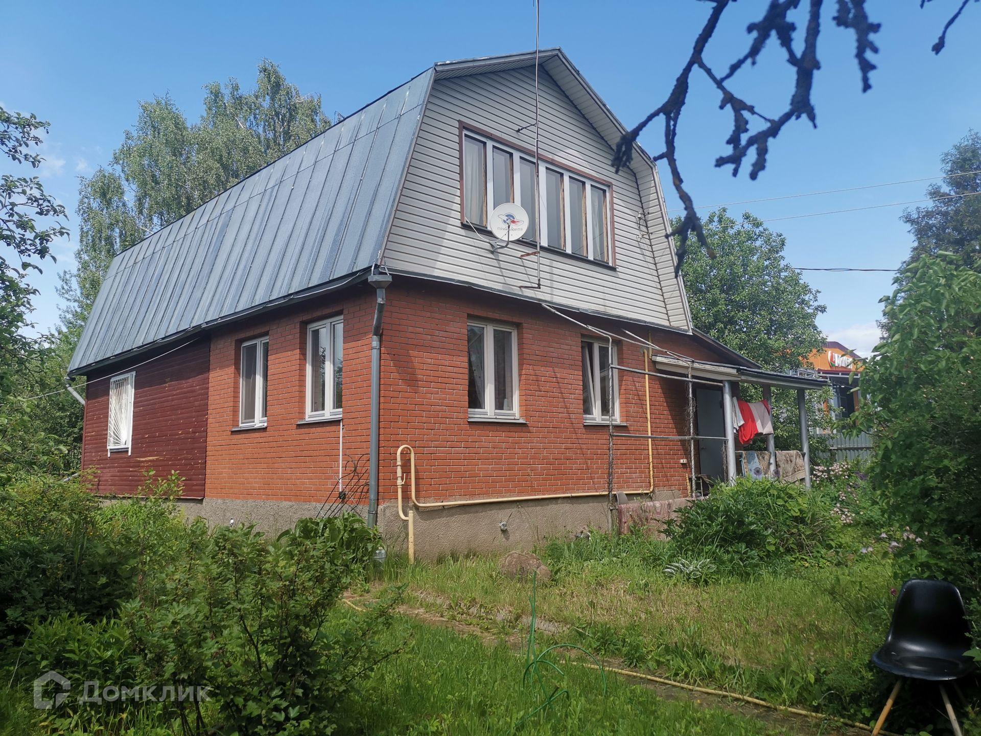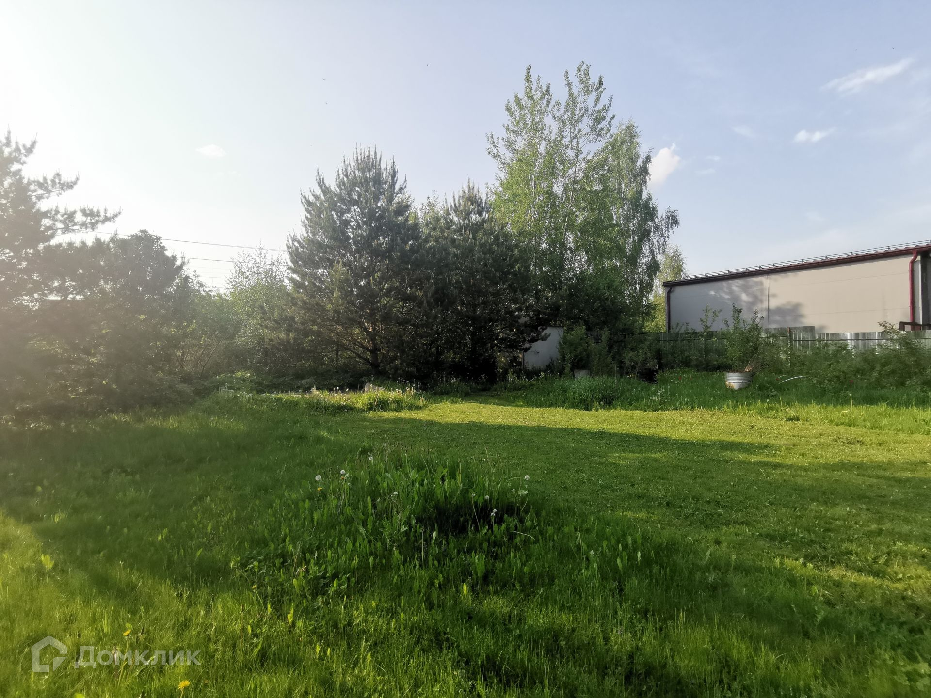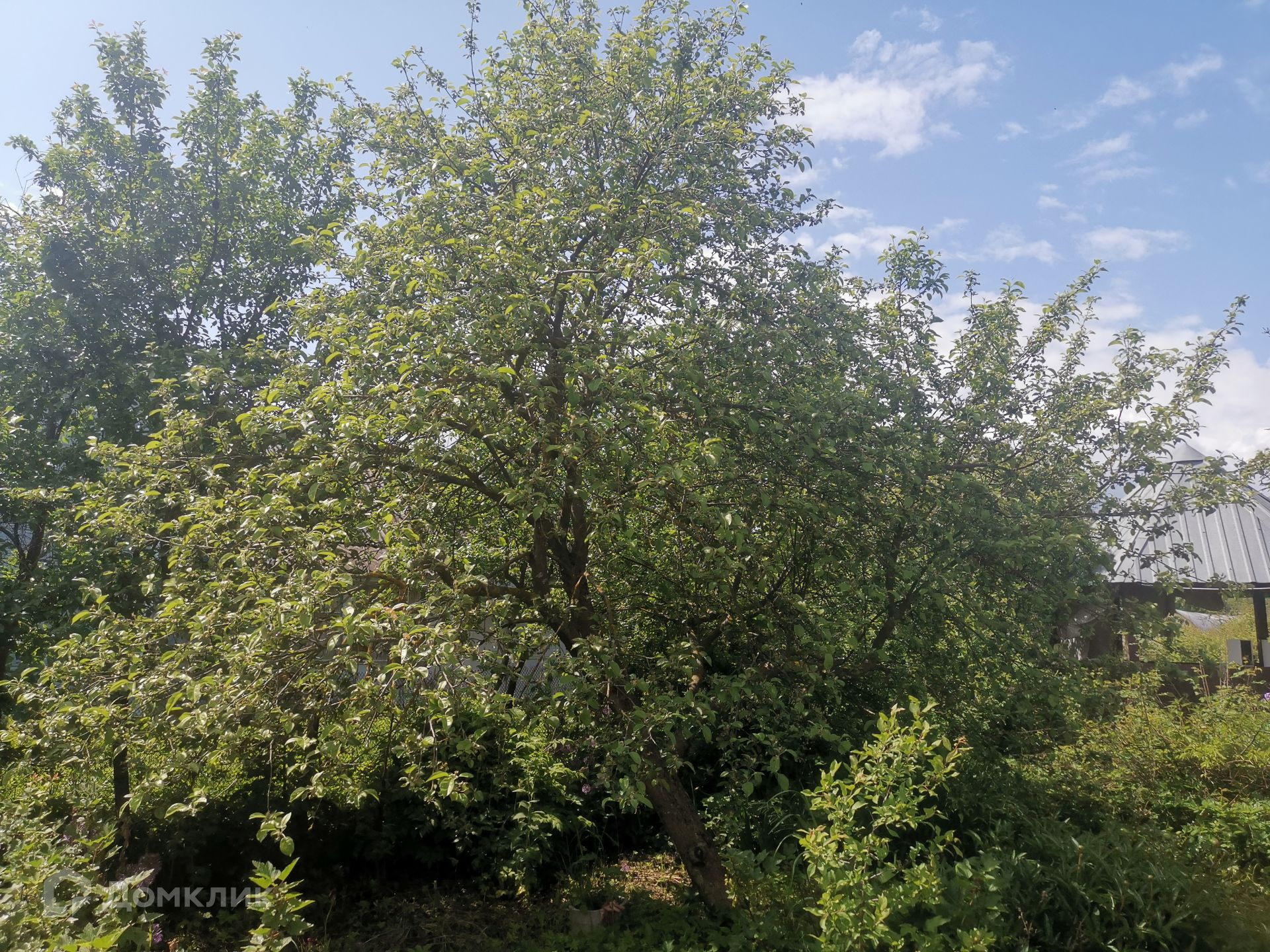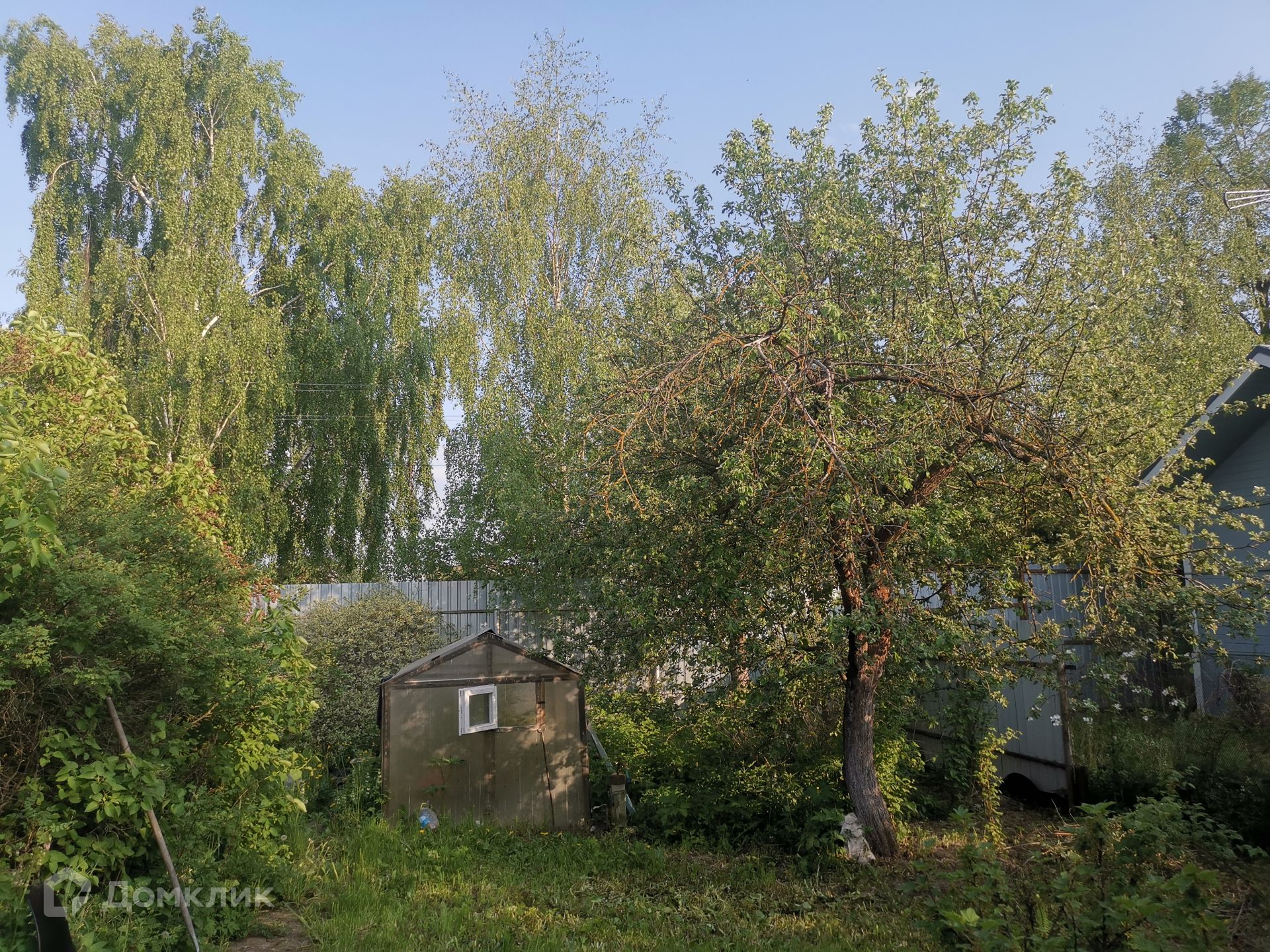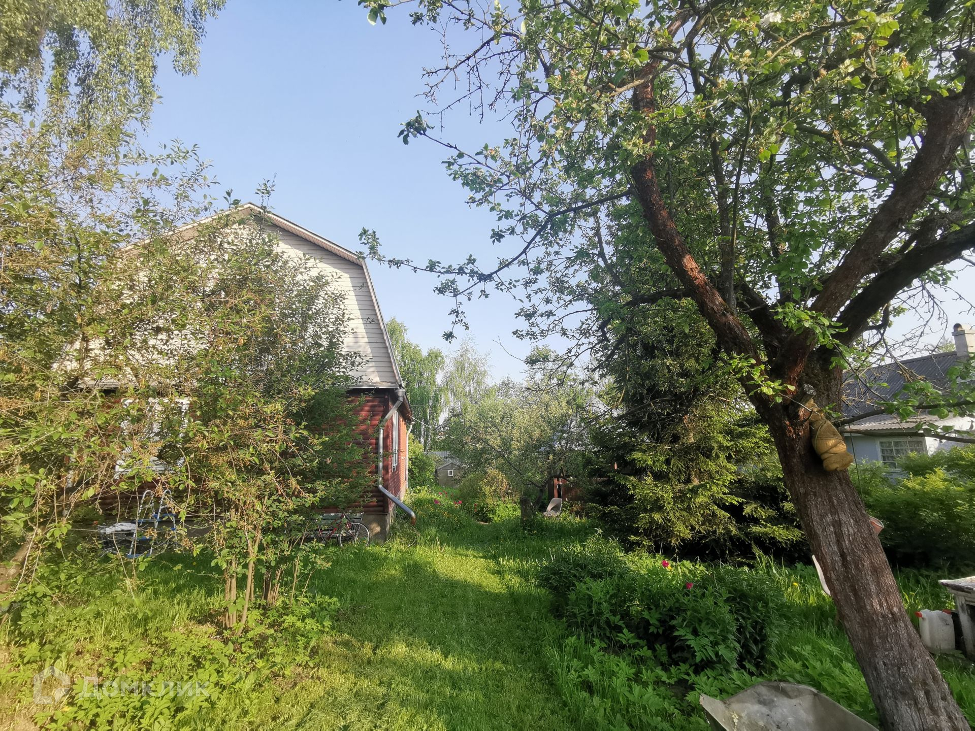 Дом стоит на участке площадью 15 соток. На участке предусмотрено место для установки каркасного бассейна. Справа от дома беседка. На участке красивые, плодоносящие яблони, кусты смородины, жимолость, крыжовник, слива, вишня, клубника. Есть небольшой летний домик.
