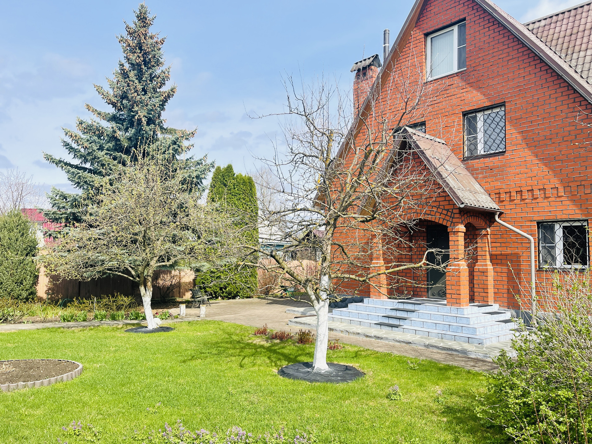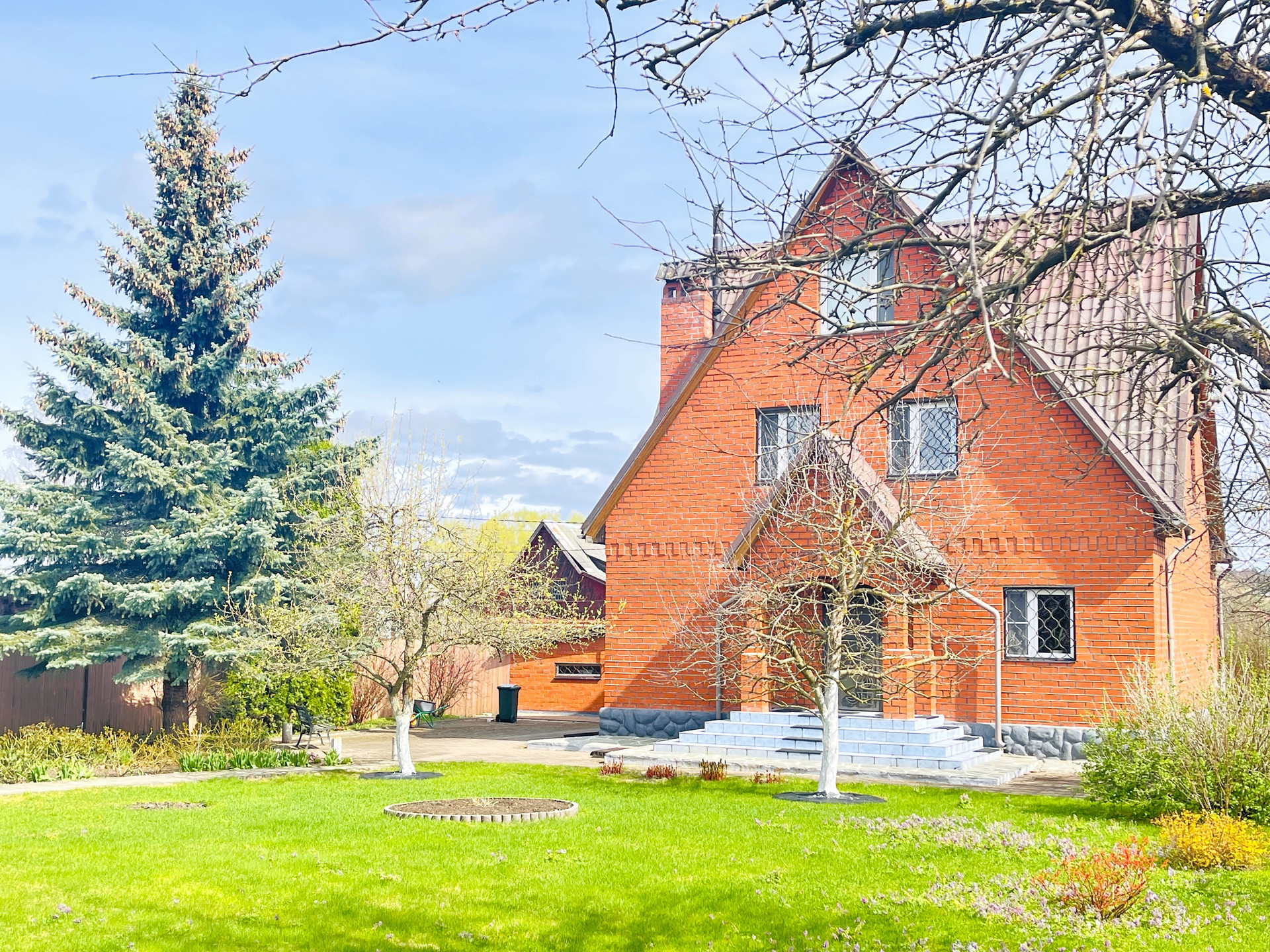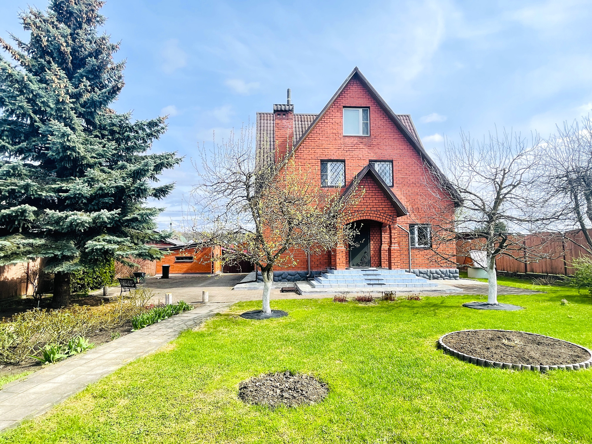 Дом 2 этажа + мансарда, построен из кирпича и бруса, фундамент ленточный и бетонные плиты, перекрытия деревянный брус. Внутренняя отделка – евровагонка.