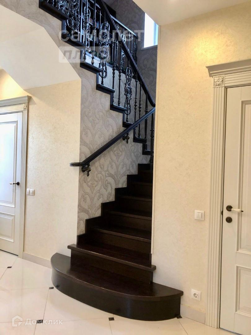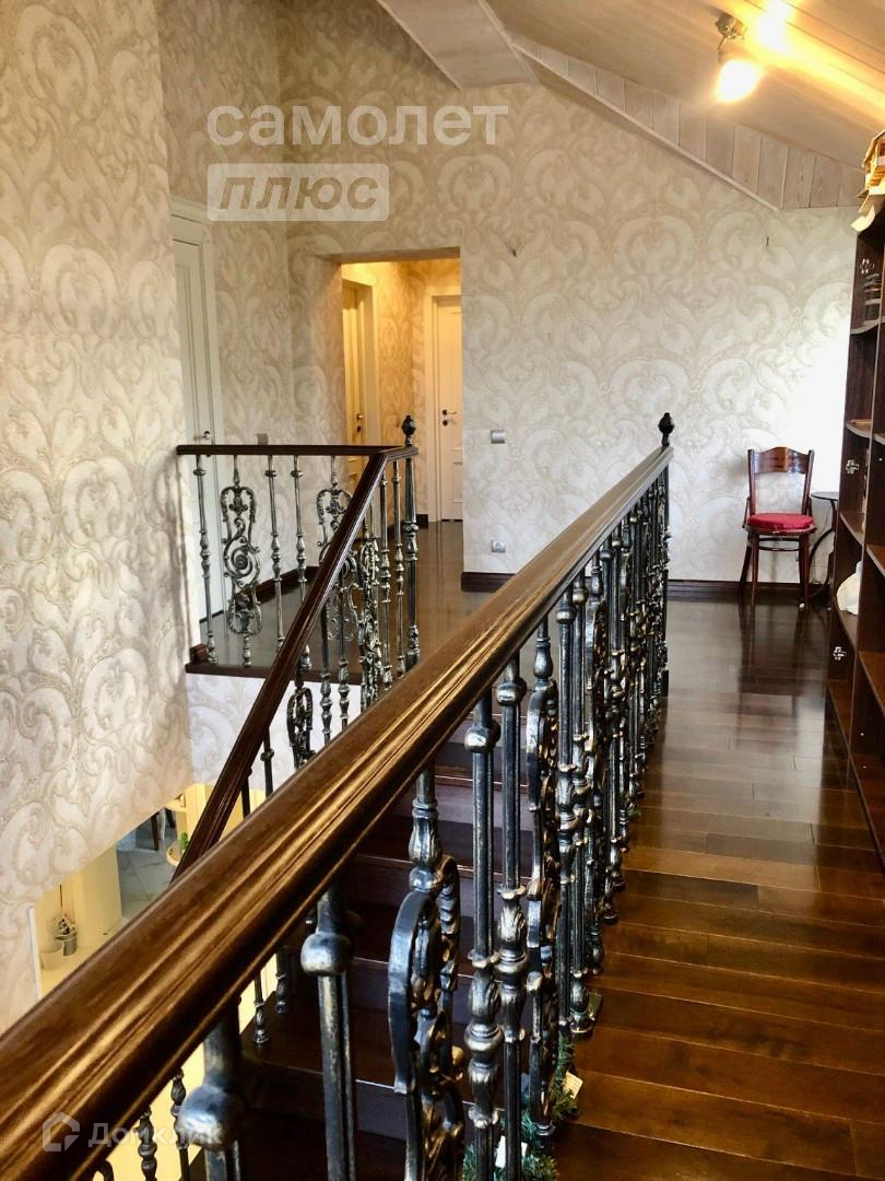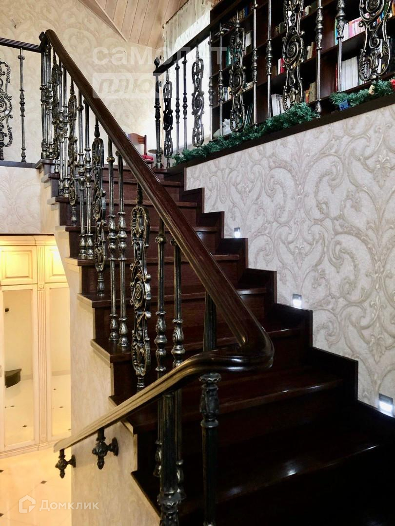 Лестница на второй этаж имеет чугунное ограждение, ступени - массив дуба.