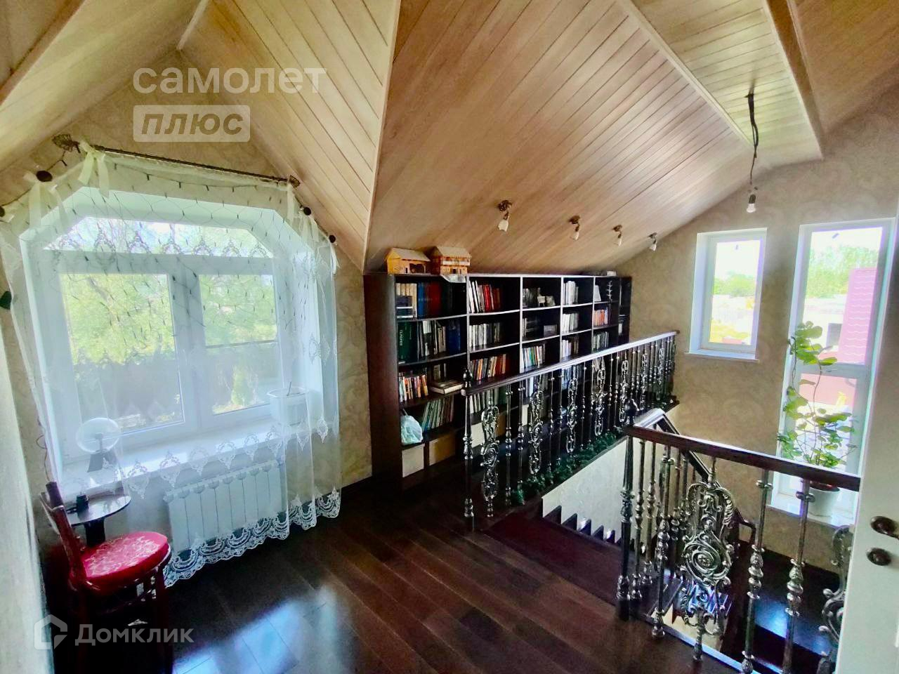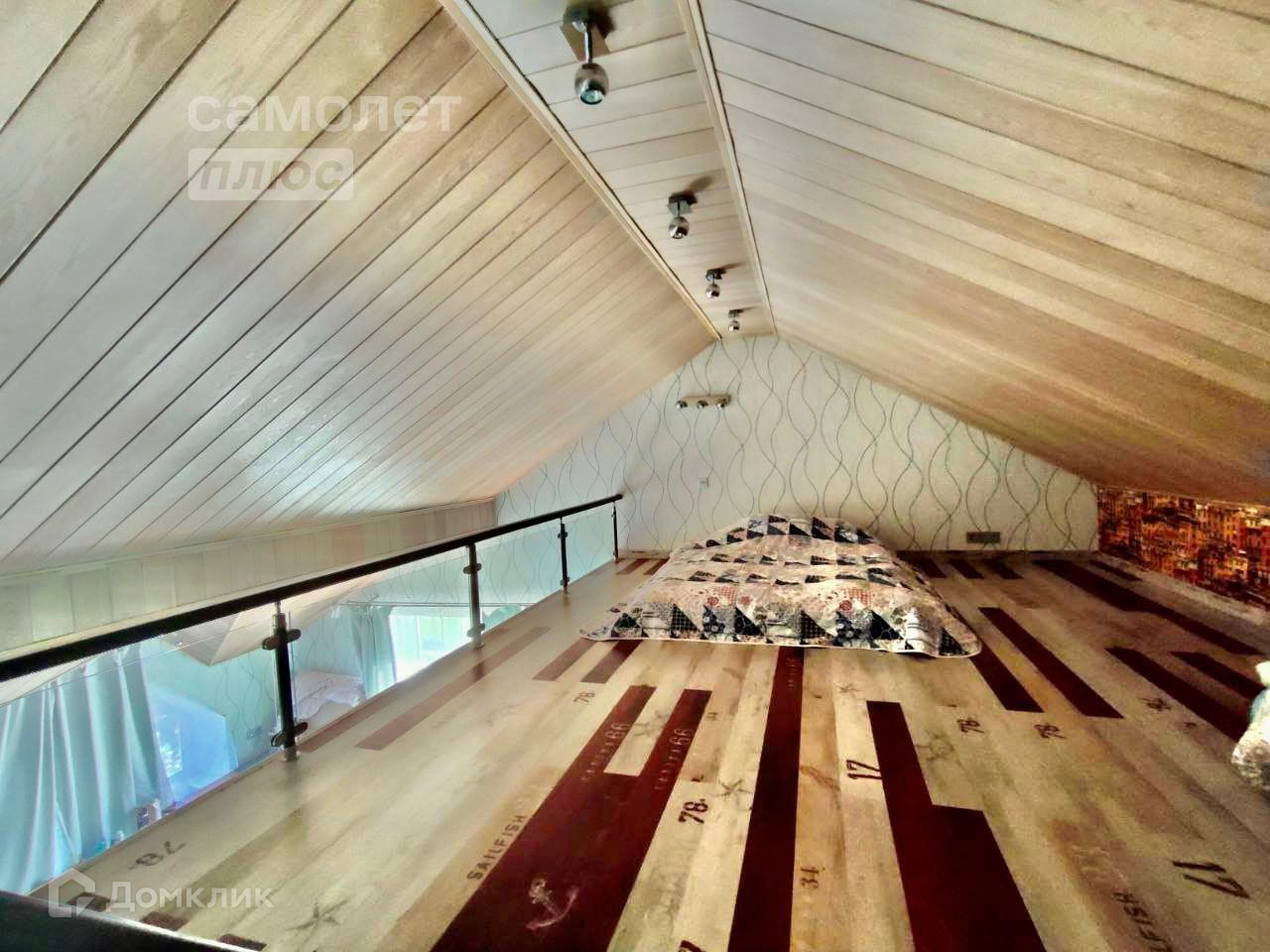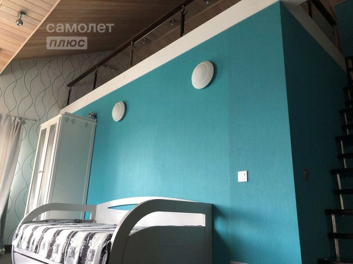 На втором этаже расположены мастер спальня со своим санузлом. Большая детская комната, первый уровень игровая и учебная зона, второй уровень – спальная зона. И еще одна спальня. Полы выполнены из массивной доски.