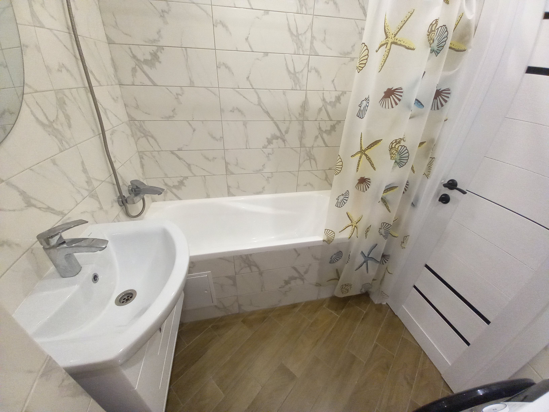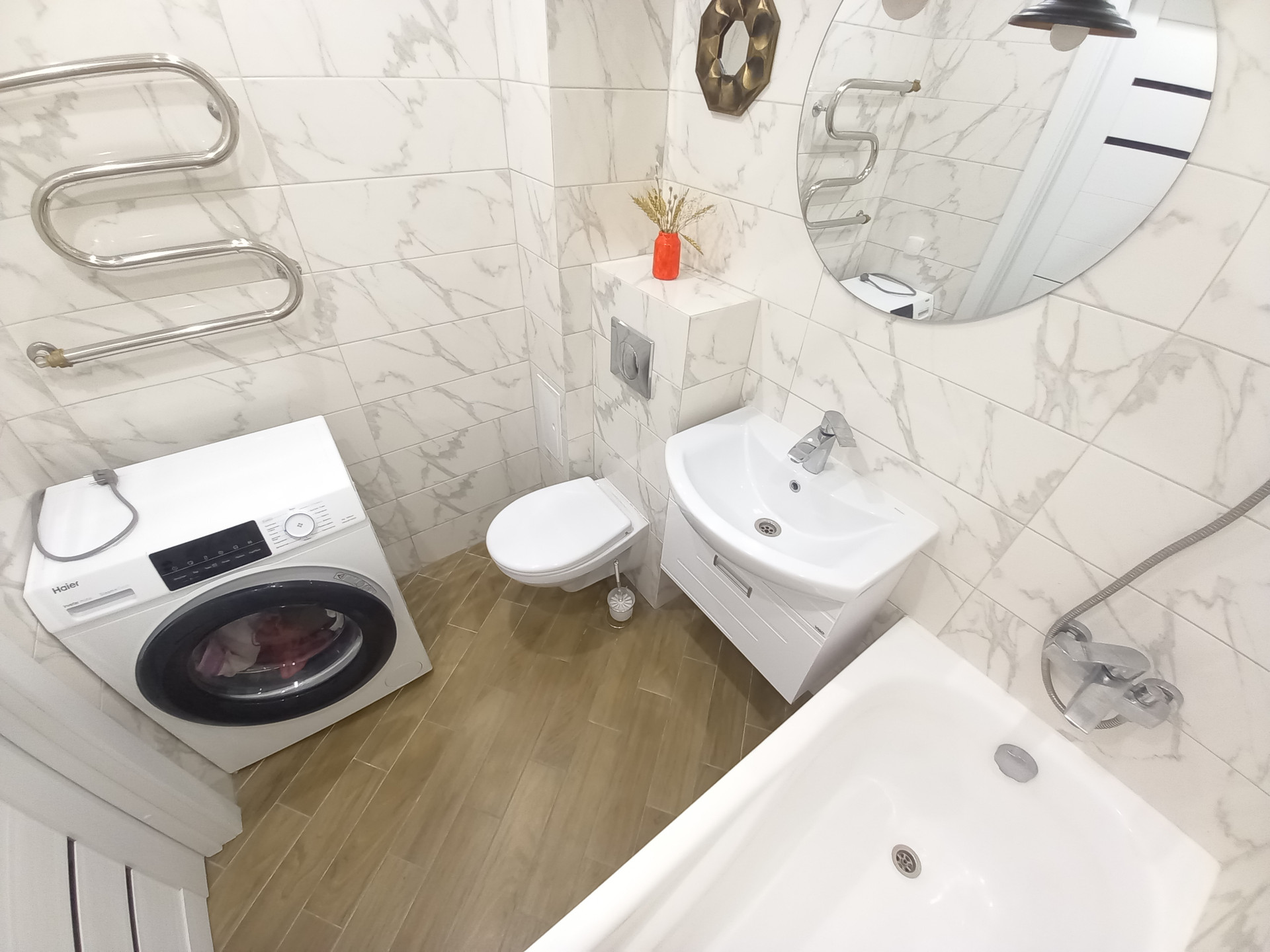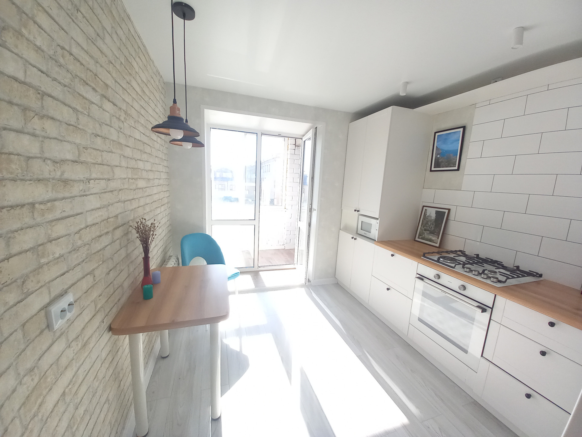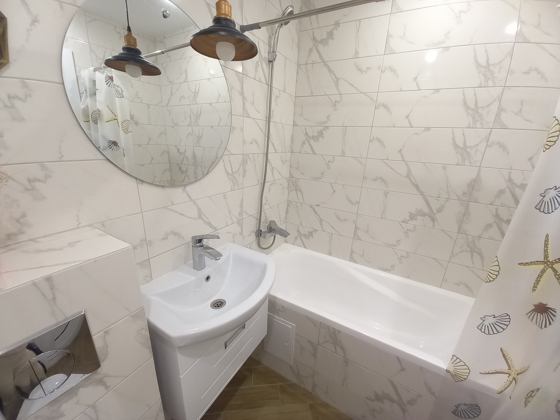 Санузел совмещенный в современном кафеле, пластиковые окна, остается встроенная кухня с техникой, ремонт в квартире сделан в светлых тонах из качественных материалов.