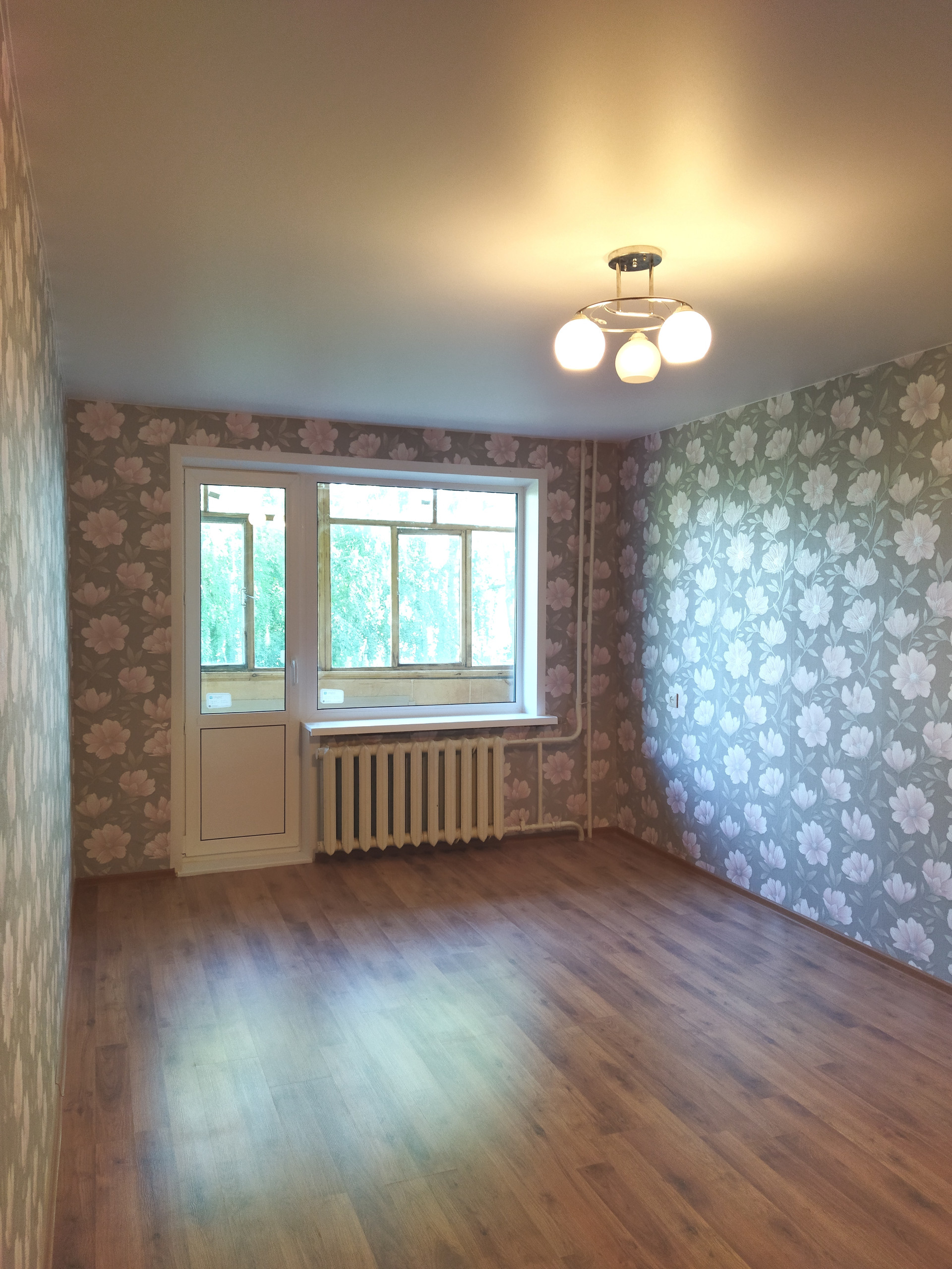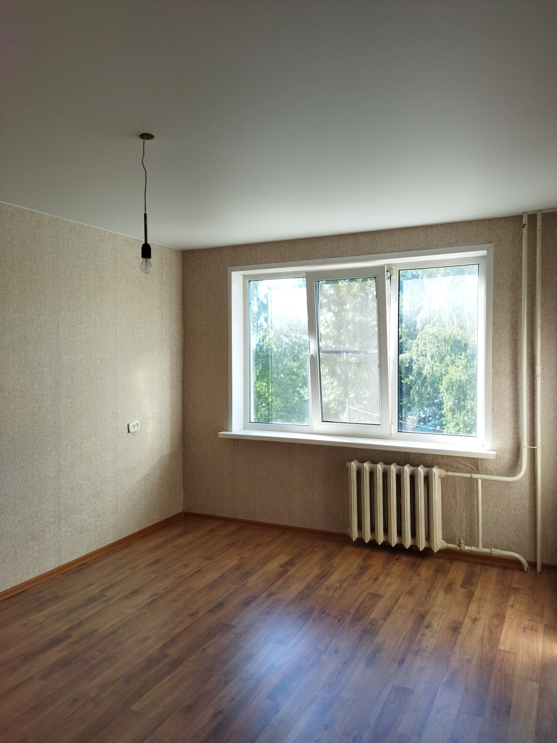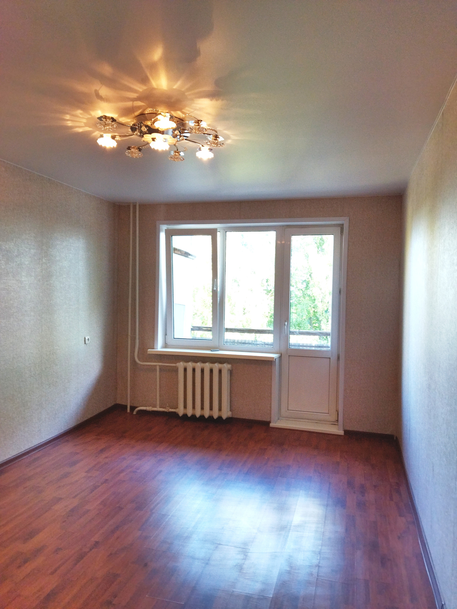 Во всей квартире натяжные потолки и пластиковые окна, на полу – ламинат, межкомнатные филенчатые двери.